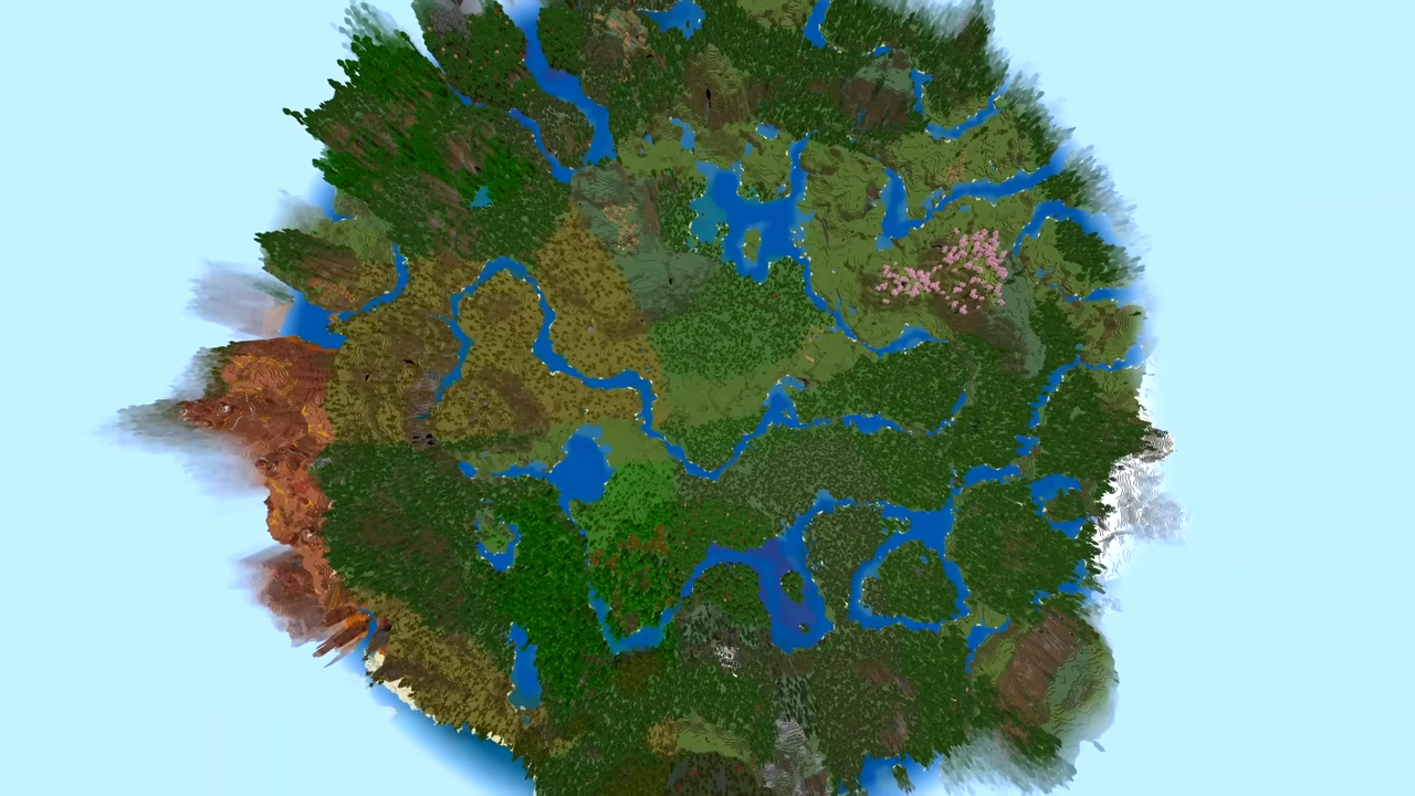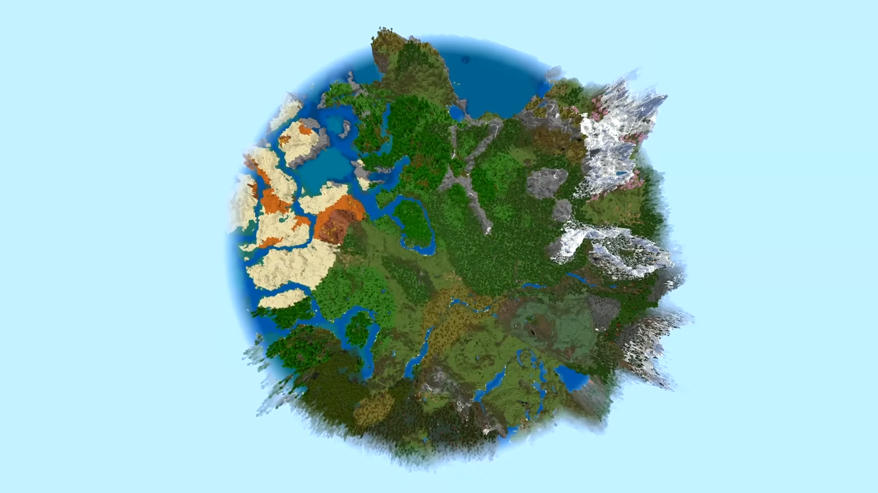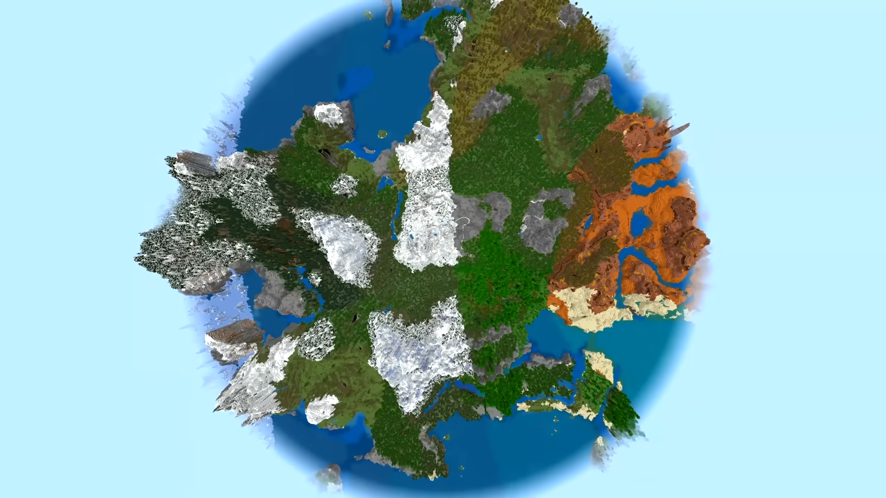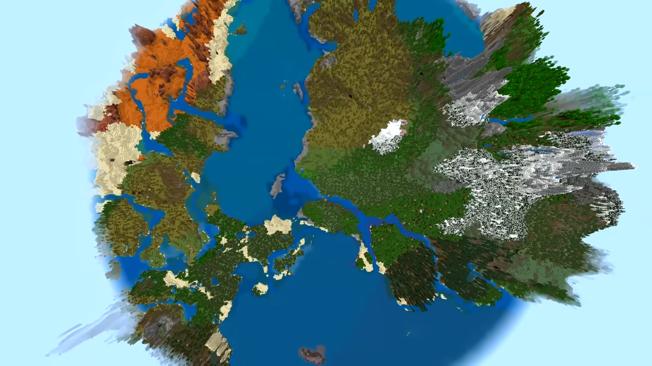 Vu du ciel, ce continent ressemble à une immense lettre C. Au nord, des biomes froids avec des pics de glace marquent la limite arctique, tandis que le sud offre déserts et badlands. Entre les deux : jungles, savanes, plaines ensoleillées et forêts fleuries. Si vous partez explorer au-delà des côtes, vous trouverez un désert géant avec plus de 20 villages et 18 temples, et à l’opposé, un océan gelé connecté à un paysage hivernal de 12 000 blocs de large.