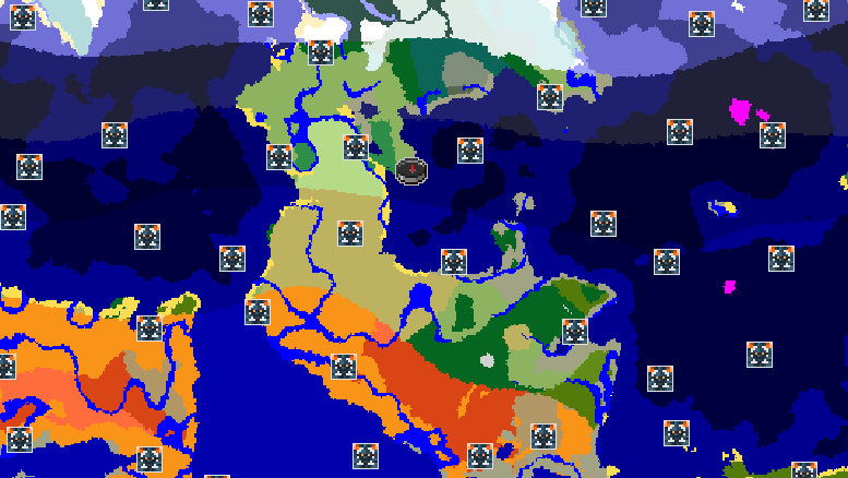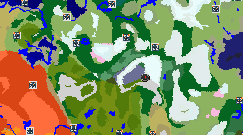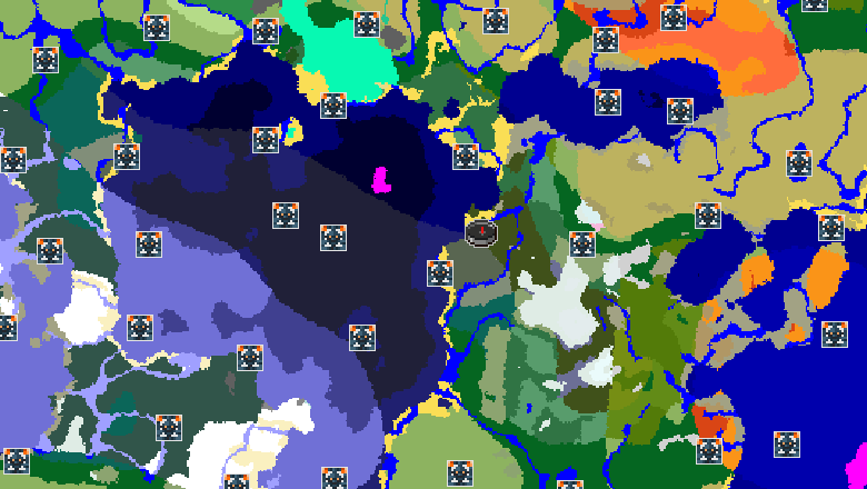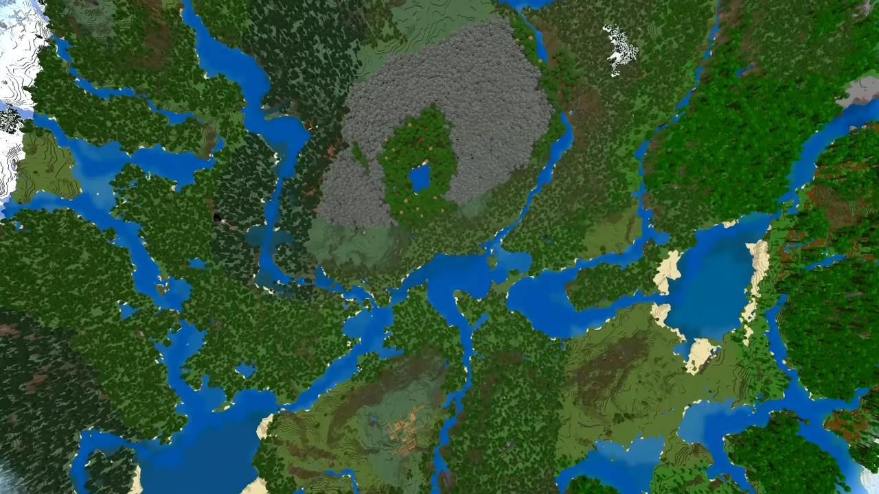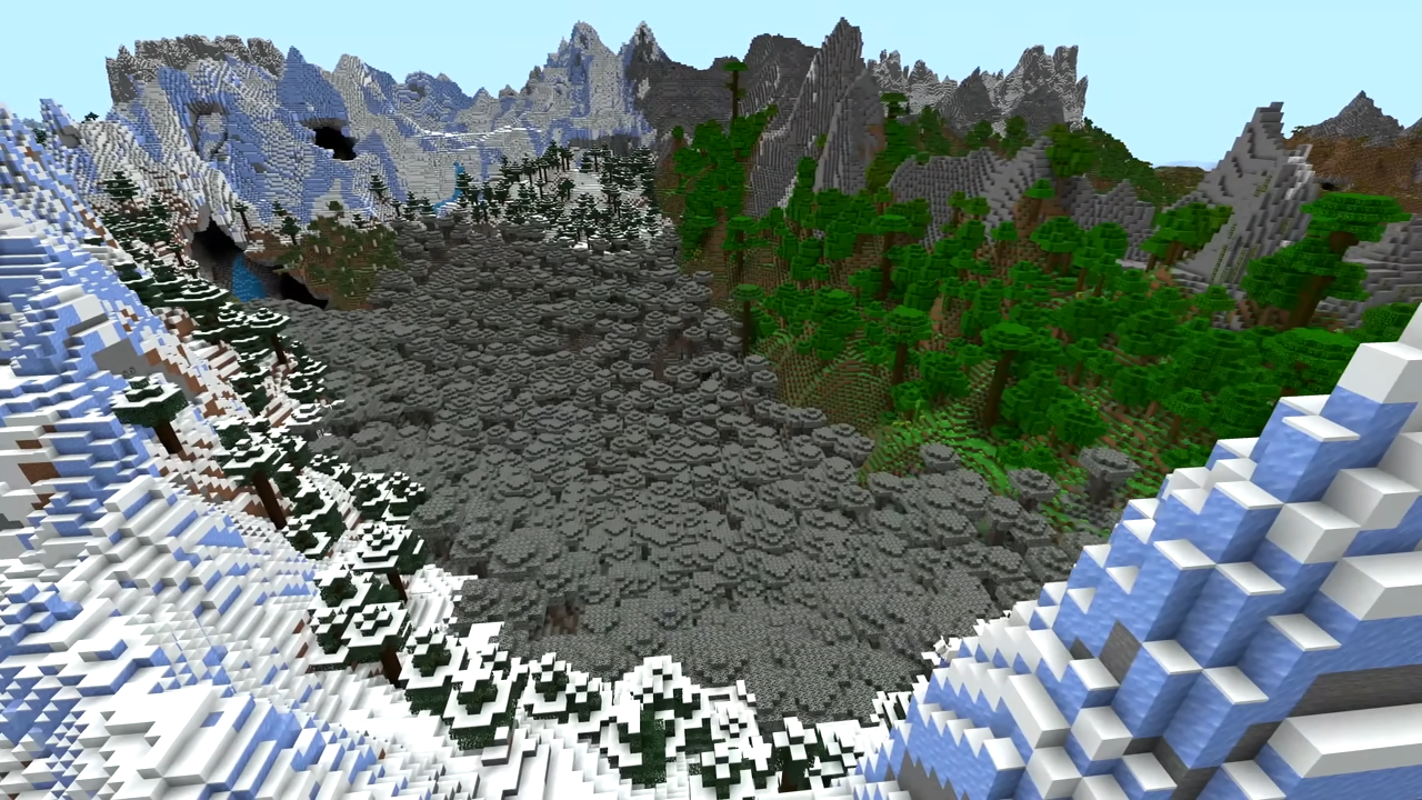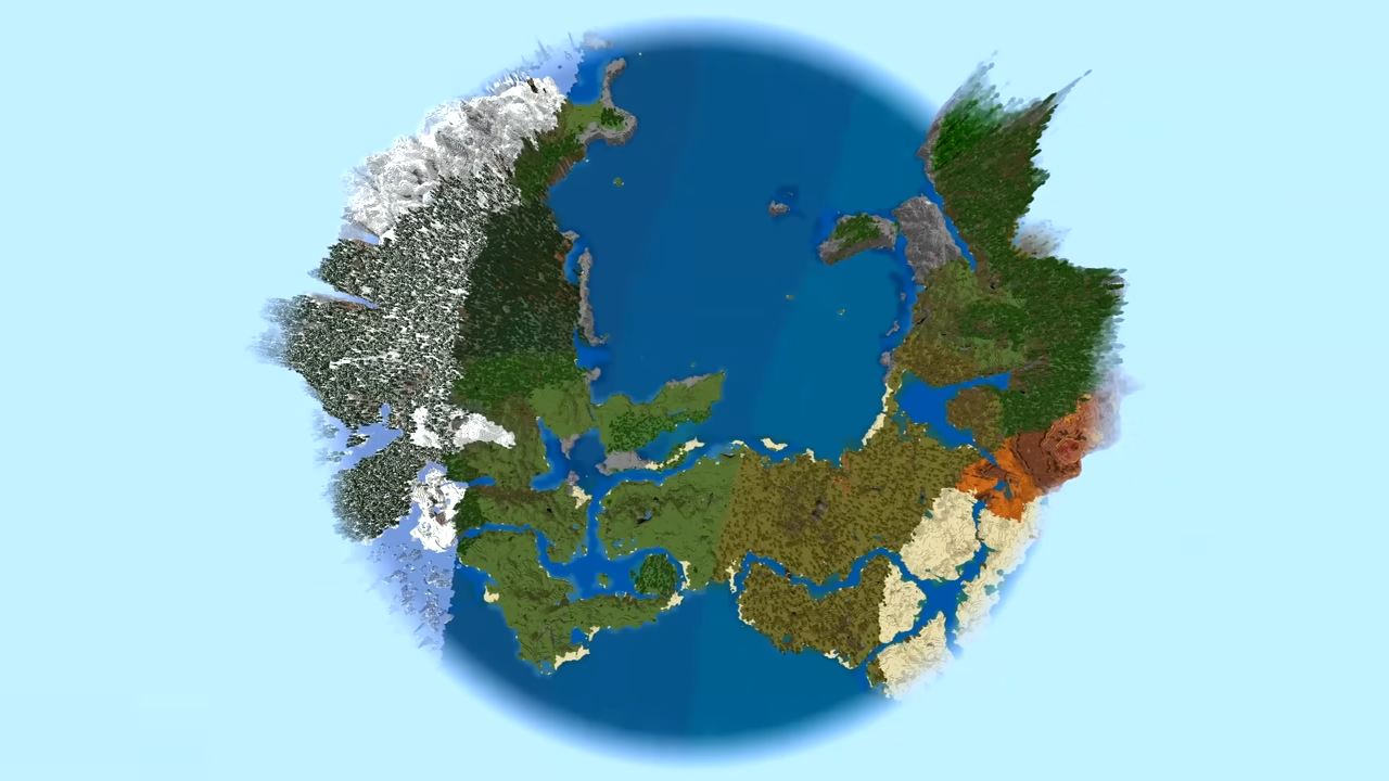 Vu du ciel, ce continent ressemble à une immense lettre C. Au nord, des biomes froids avec des pics de glace marquent la limite arctique, tandis que le sud offre déserts et badlands. Entre les deux : jungles, savanes, plaines ensoleillées et forêts fleuries. Si vous partez explorer au-delà des côtes, vous trouverez un désert géant avec plus de 20 villages et 18 temples, et à l’opposé, un océan gelé connecté à un paysage hivernal de 12 000 blocs de large.