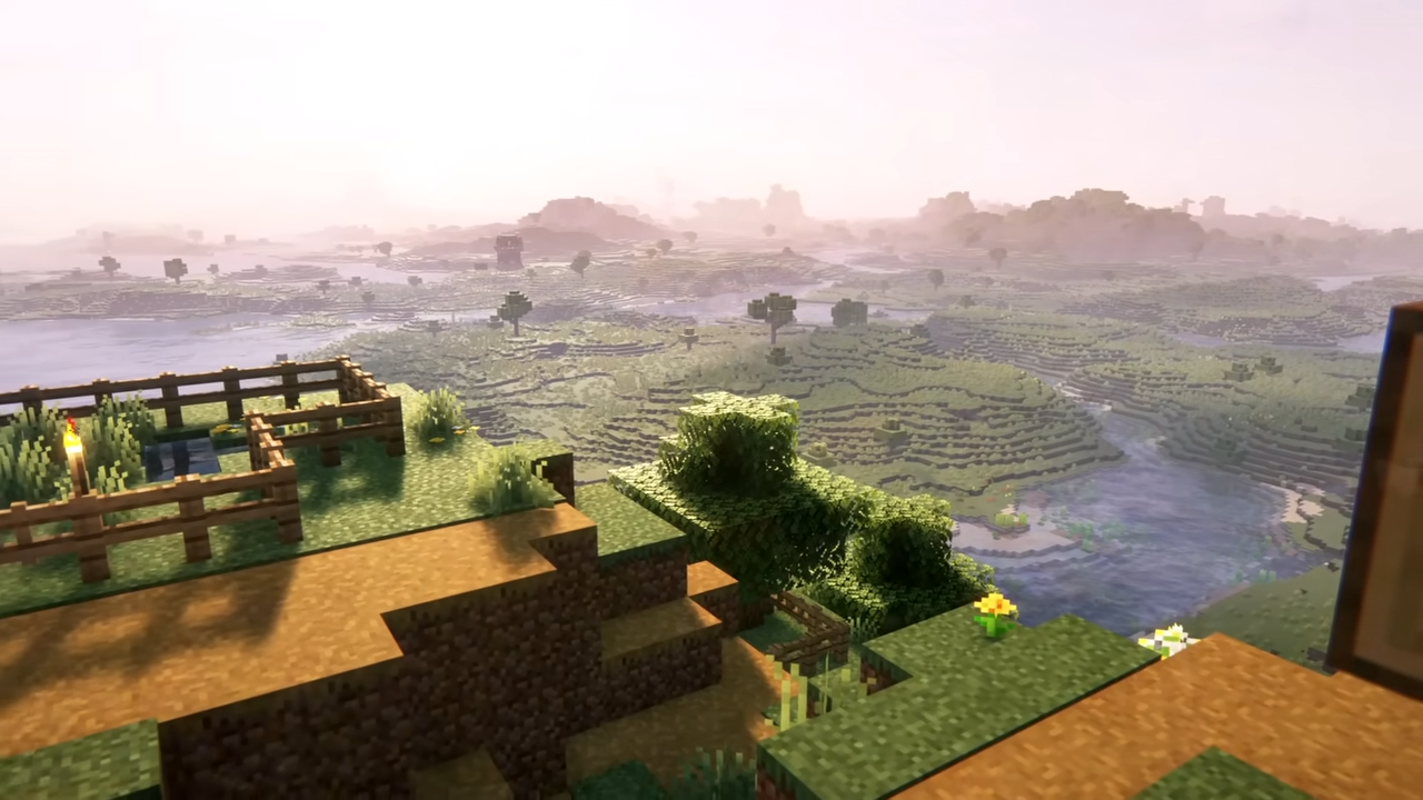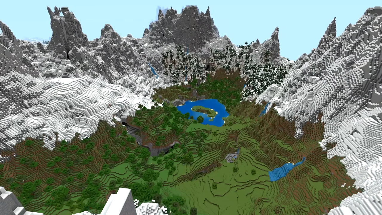 Vous apparaissez au sommet d’une montagne monumentale offrant une vue panoramique sur un continent entier. Les biomes se succèdent le long de la même côte : forêts enneigées, pics glacés, jungle de bambou, badlands boisés et vallées de forêts de bouleaux. Ce décor naturel est parfait pour établir une base centrale et régner sur un “royaume” divisé en régions climatiques distinctes.