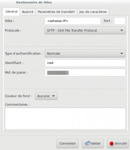 Nous allons donc ajouter un site : votre serveur ! Pour ce faire, vous l’aurez compris, il suffit de cliquer sur “Nouveau Site”. Un nouvel élément apparaîtra donc dans la liste, vous pourrez donc lui donner un nom (“VPS”, par exemple), puis appuyer sur “Entrée“, pour valider votre saise. Vous pourrez maintenant configurer les paramètres de votre VPS. Veillez à ce qu’il soit configuré comme sur la capture d’écran suivante, notamment au niveau du protocole, qui doit être SFTP :