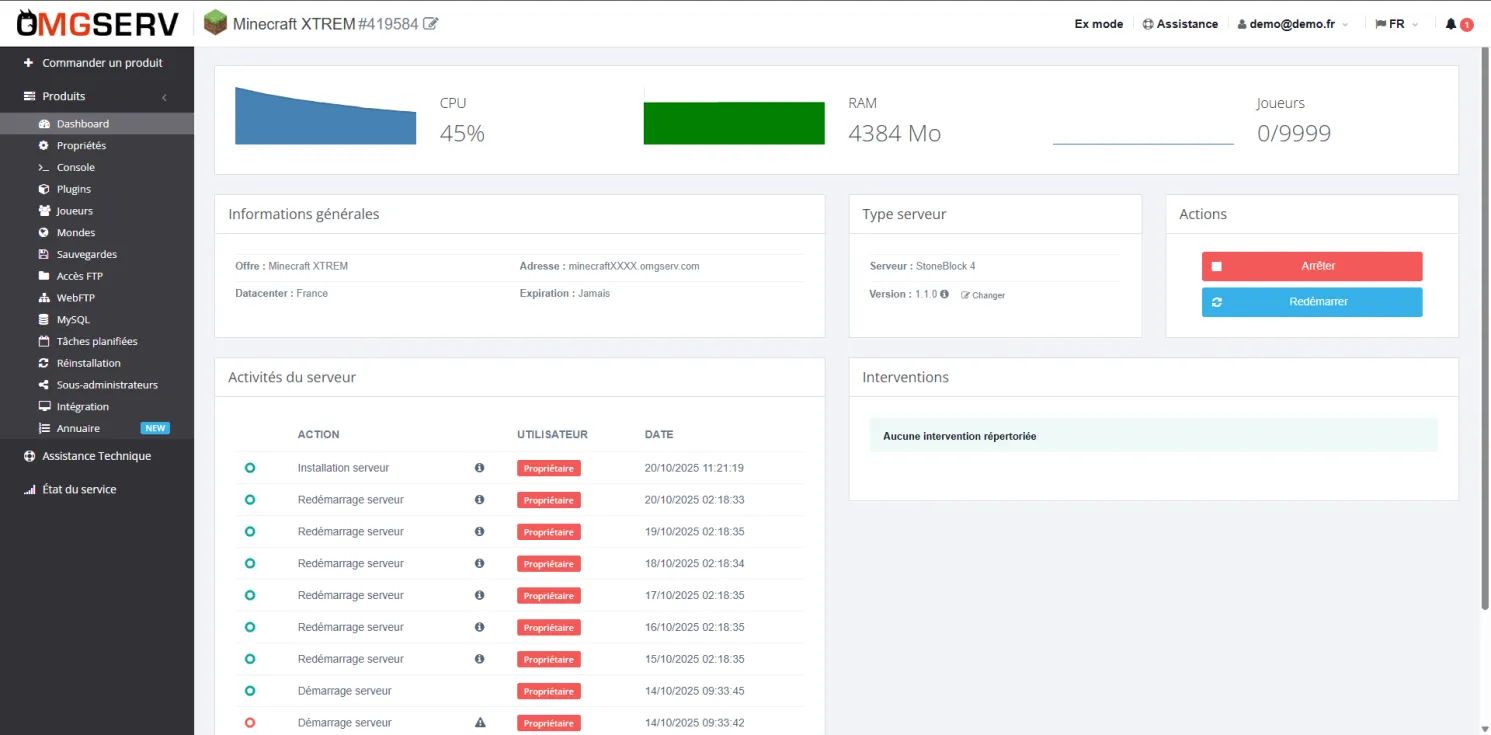 Que l’on choisisse une offre simple ou plus avancée, le panel OMGSERV fournit des outils clairs : installation en un clic des versions Vanilla, Forge, Fabric ou Spigot, console en direct, Web-FTP, sauvegardes automatiques et tâches programmées.