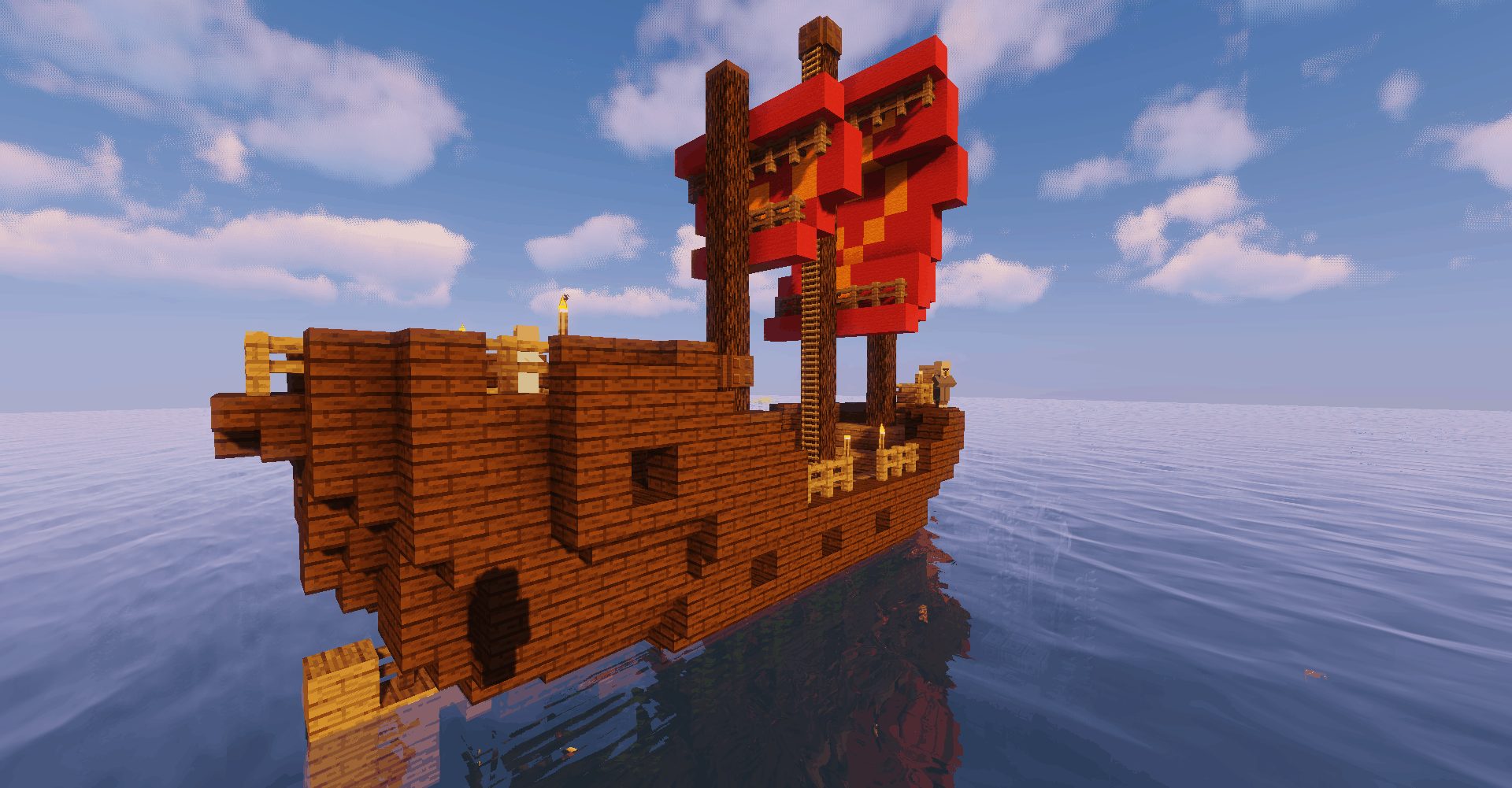 Le datapack Ships out on the oceans, créé par Ercerus, propose une explication simple et efficace, en ajoutant des navires voguant sur l’eau.