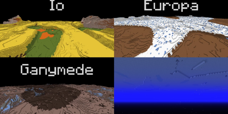 Une des nombreuses lune de Jupiter, Io se distingue par ses paysages pour le moins colorés. Ils sont en réalité constitués de poudre de béton, plutôt pratique pour faire de grosses réserves ! La gravité y est de 0.18g, et vous pourrez trouver de nombreux minerais, particulièrement du lapis-lazuli et de la redstone.