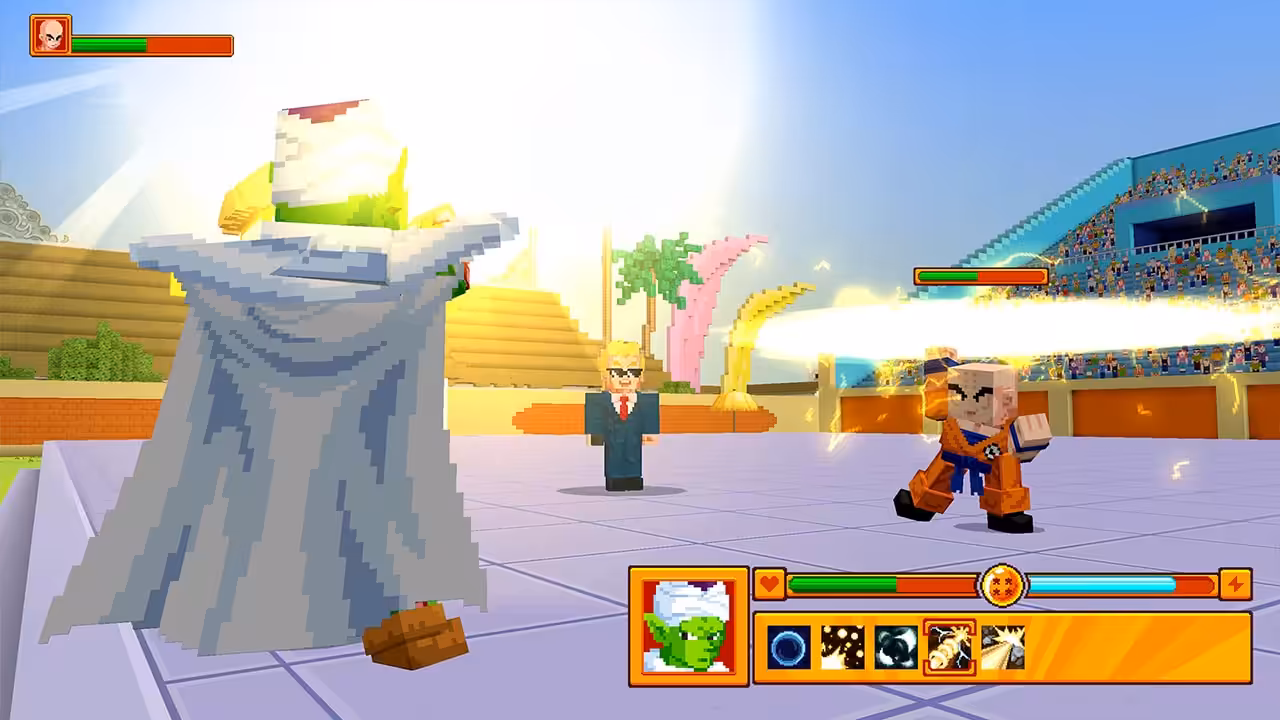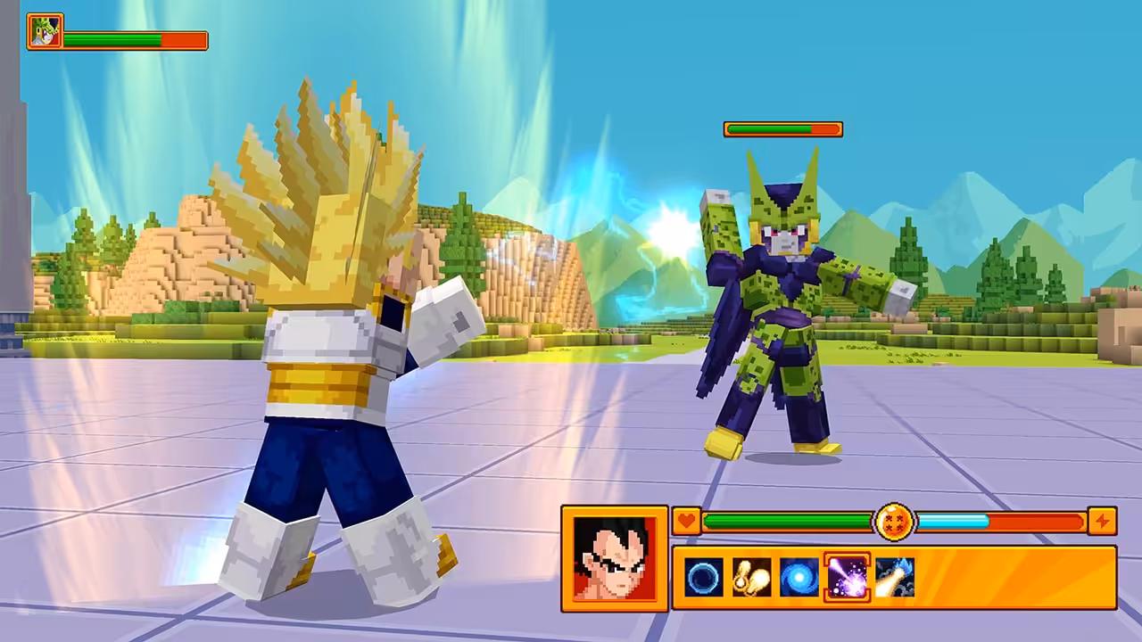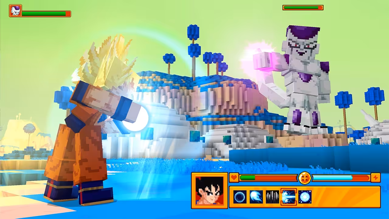 Chaque combattant dispose de ses propres attaques, inspirées du manga. Le Kamehameha, le Final Flash ou encore les transformations Super Saiyan sont au rendez-vous, avec des effets visuels adaptés à l’univers cubique du jeu.