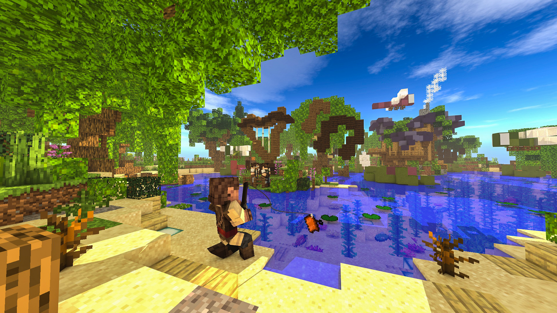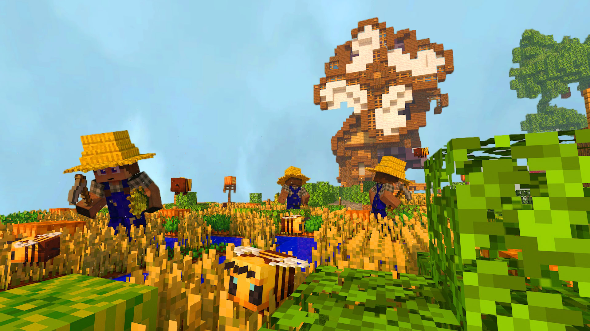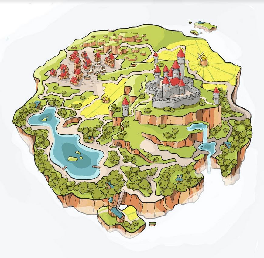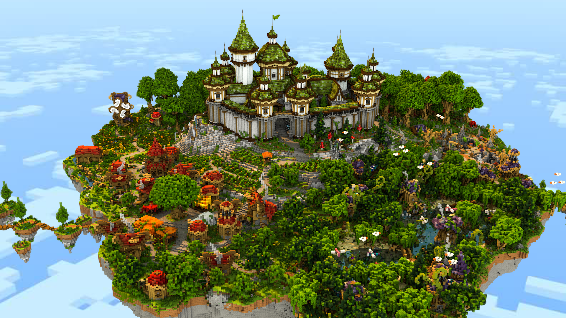Les joueurs apparaissent tous sur l’île de spawn. Cette île volante aux bâtiments colorés et à la végétation luxuriante abrite un château et une multitude de petites échoppes. C’est ici que vous pourrez gérer votre équipe, consulter le classement, mais aussi accéder aux magasins et aux habitations. En tant qu’île de spawn, il est naturellement impossible de détruire ou de poser des blocs.