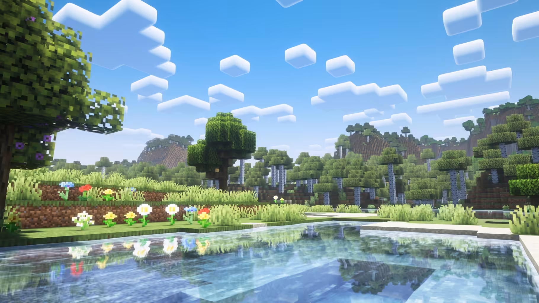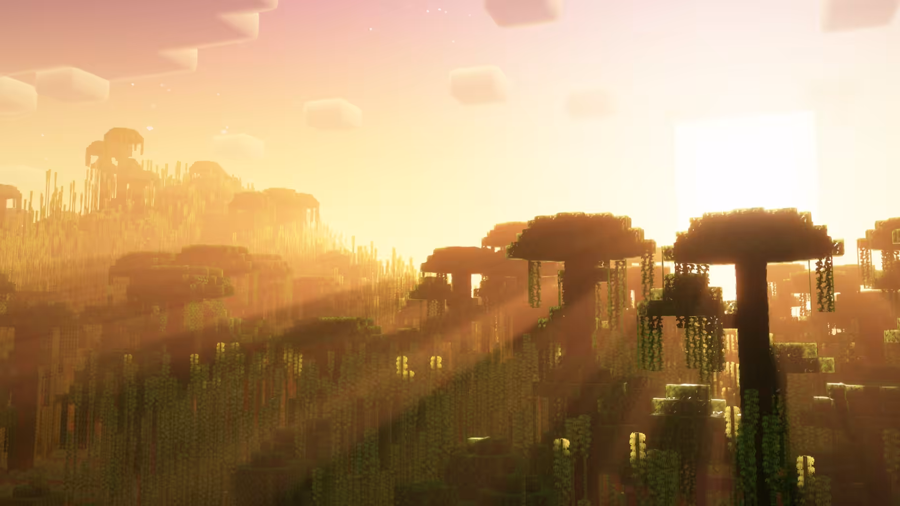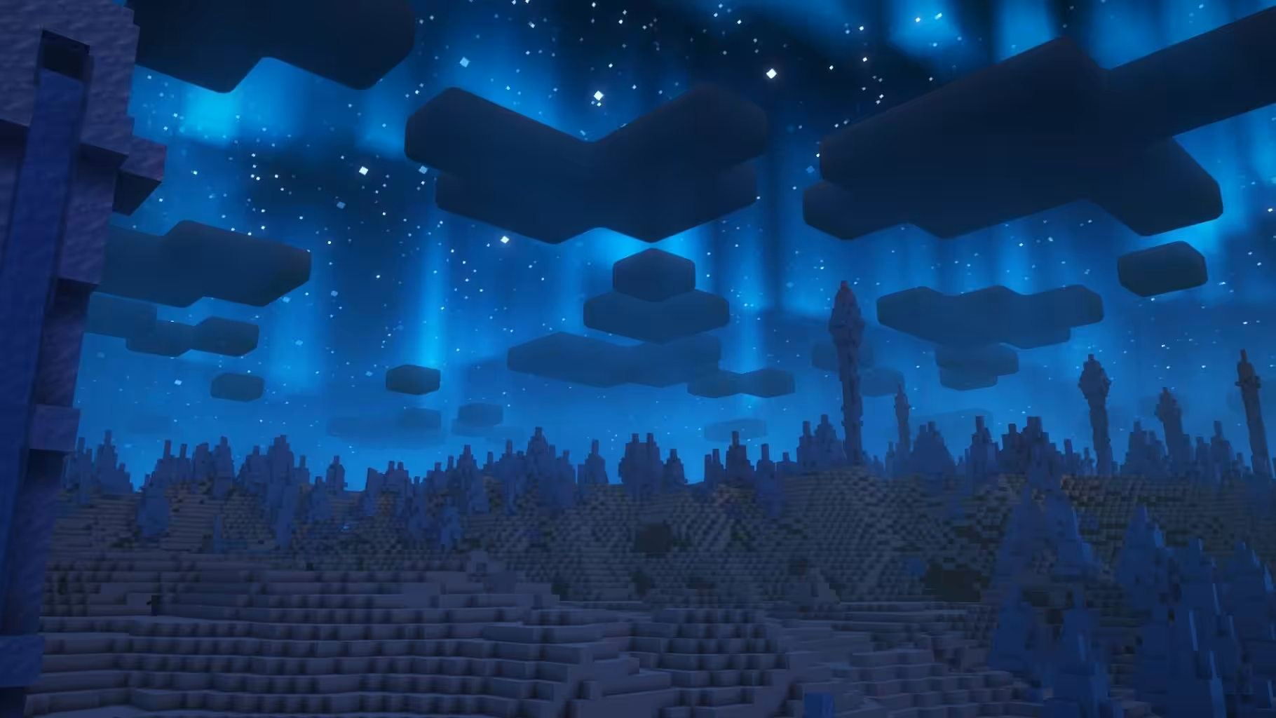 La nuit adopte un bleu fantaisie. Le ciel n’est plus “plat” : étoiles, aurores, nuages et nébuleuses s’invitent au-dessus de vos constructions. Résultat, la nuit n’est plus seulement sombre ; elle devient un décor à part entière.