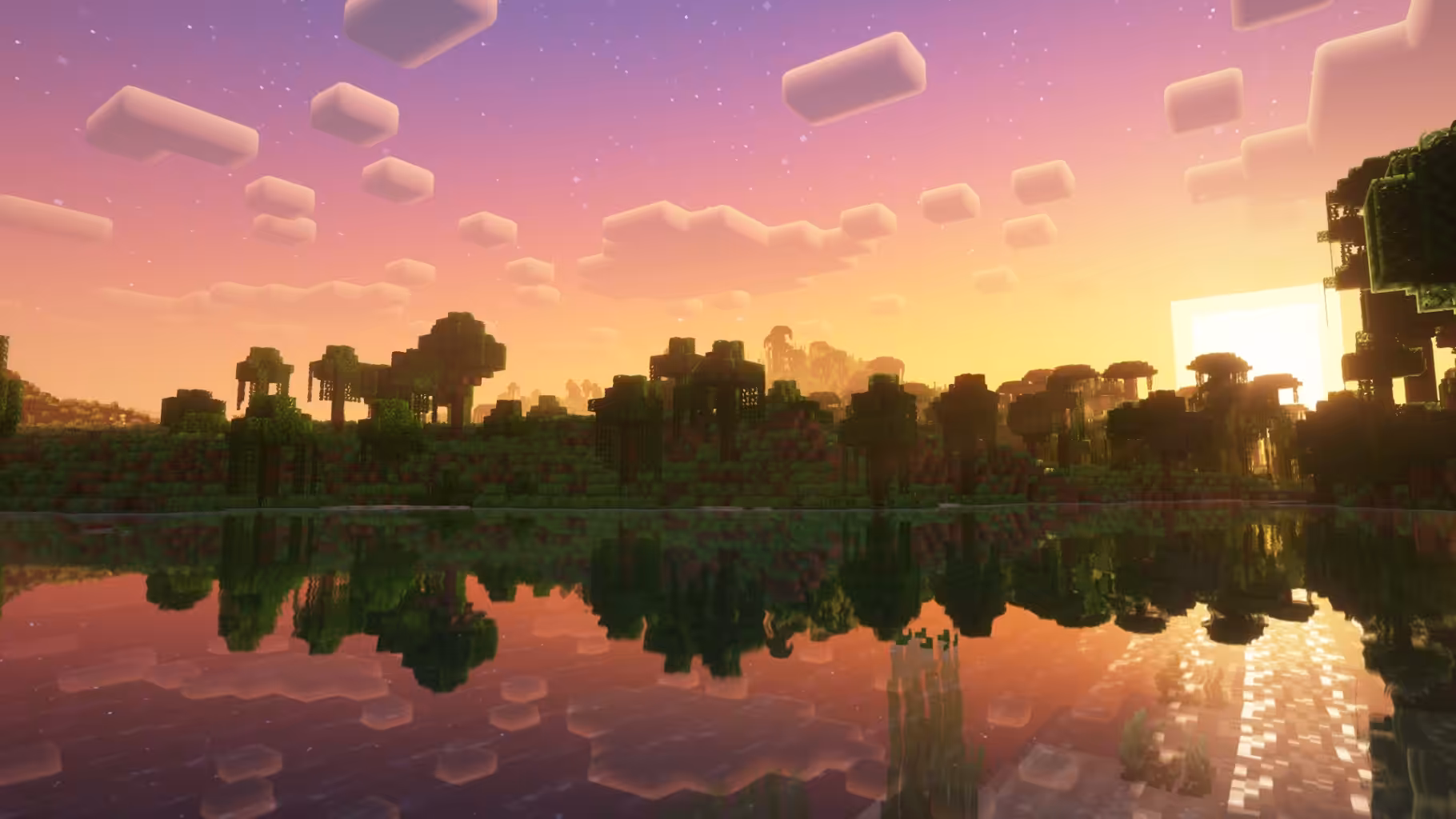 Concrètement, le shader retouche l’ambiance globale du jeu : nuits bleutées, journées plus lumineuses, ciels étoilés, aurores et nébuleuses visibles, reflets plus présents sur l’eau et les surfaces, et dimension de l’End recolorée autour d’un violet proche des Endermen. Les rayons lumineux gagnent en intensité, ce qui donne des scènes très marquées au lever et au coucher du soleil.