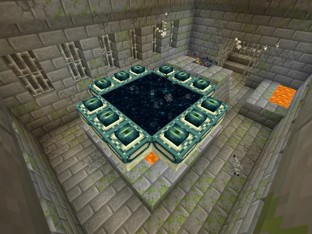 Il faut savoir que certains blocs du cadre peuvent, rarement, contenir déjà un œil intégré. C’est totalement aléatoire, et dans la majorité des cas, plusieurs emplacements seront vides. Mieux vaut donc arriver avec au moins 12 yeux de l’Ender pour ne pas être bloqué sur place.