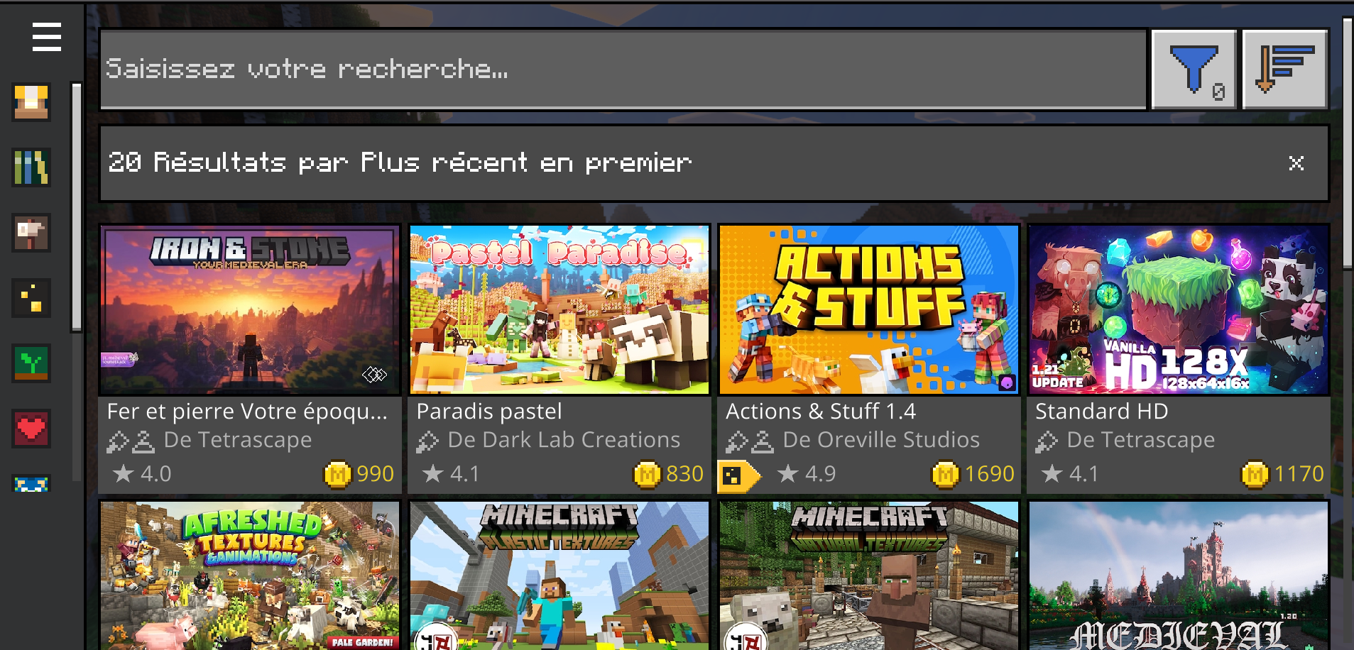 Bedrock propose une expérience plus contrôlée via le Minecraft Marketplace, une boutique officielle où l’on trouve :