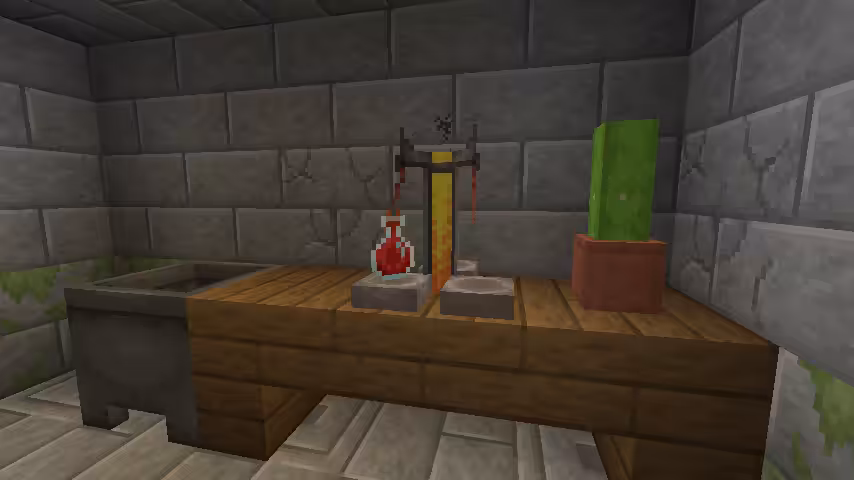 - Igloo (biomes froids) : le sous-sol abrite souvent un alambic et parfois une potion de Faiblesse éclaboussante prête à l’emploi — solution “clé en main” pour un premier sauvetage.