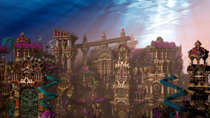 Gallia-Sea est un monde marin au sein duquel hommes-poissons vivent en harmonie avec les fonds marins et la vie aquatique. En est la preuve ici, avec le village de Galirum, où l’on peut voir des dizaines d’habitations parmi rochers, algues et poissons. Nageant tout autour, vous pourrez également profiter de très nombreux organiques : espadon, poissons clowns et autres poisson-lanterne. Un univers très coloré et dépaysant dans lequel nous pouvons également apercevoir un immense temple, certainement dédié à Poséidon. Pourrait-on l’apercevoir, veillant sur cette cité ?
