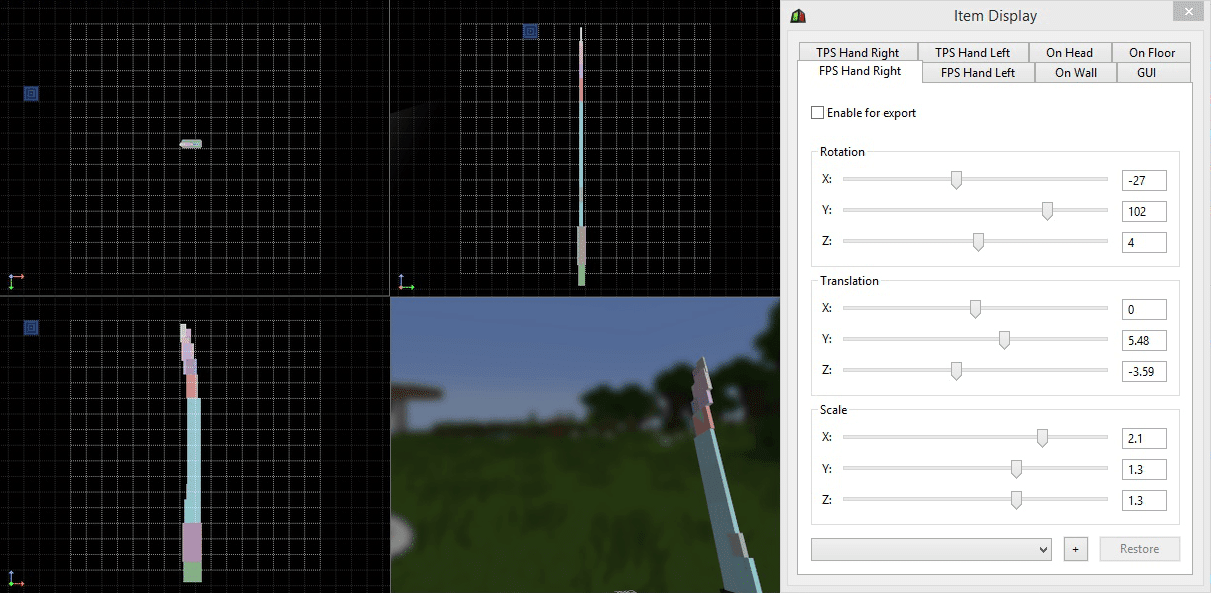 La version 1.9 (ses nombreuses snapshots pour le moment) nous a offert la possibilité de gérer de manière très simple l’affichage des modèles en jeu. Cela nous permet entre autres d’afficher très différemment un même modèle selon que l’on joue en première ou en troisième personne, l’objet en main gauche ou en main droite, ou encore dans l’inventaire.
