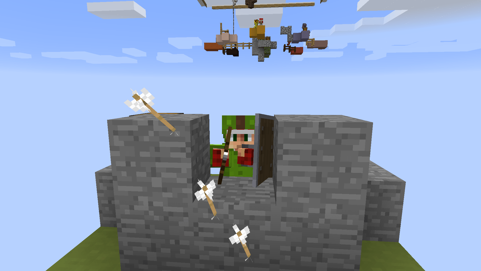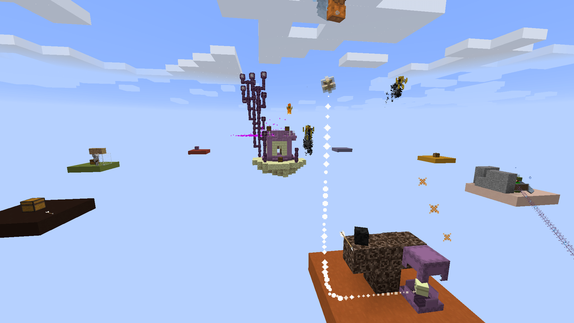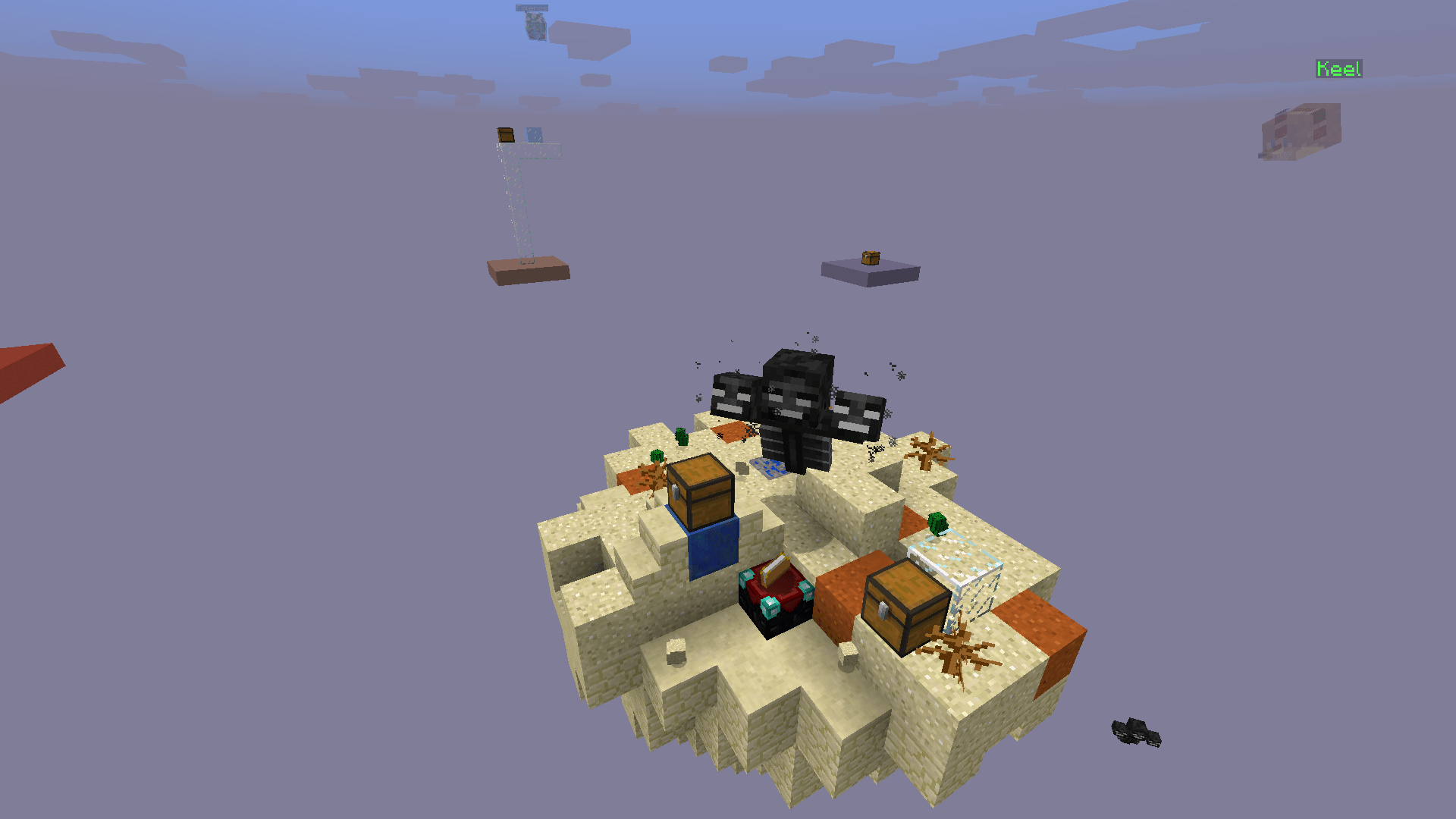 Une fois que vous aurez paramétré votre partie et choisi votre kit, la partie se lancera. Comme vous pouvez le voir, la construction reste simple puisque seule l’île centrale change en fonction de l’arène choisie. Comme dans un Skywars classique, votre but sera d’être le dernier survivant, en vous aidant de votre kit mais aussi des coffres qui apparaîtront sur la map. À la différence des Skywarsclassiques, les coffres n’apparaissent pas immédiatement. En effet, les coffres des îles périphériques n’apparaissent qu’au bout de dix secondes, quant aux coffres de l’île centrale, il faudra attendre une minute. Ceci permettra de ralentir un peu le gameplay, ce qui évitera une domination de la première personne parvenant à accéder à l’île centrale. Comme dans tout Skywars, le contenu des coffres sera meilleur sur l’île centrale. Notez également que la map est entourée de blocs de barrière, vous permettant ainsi d’éviter de tomber dans le vide, en tentant de poser un bloc sur ces parois. Par ailleurs, si vous souhaitez pimenter un peu votre partie, vous pouvez aussi choisir d’activer le mode Insane, qui aura pour effet de rajouter des événements aléatoires.
