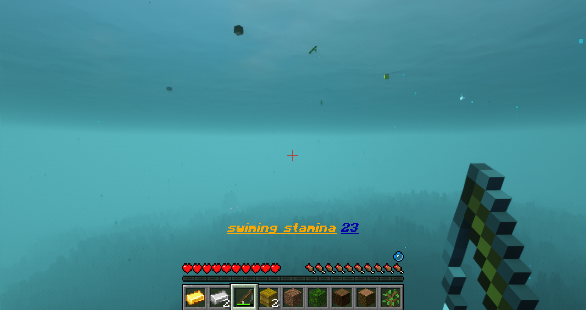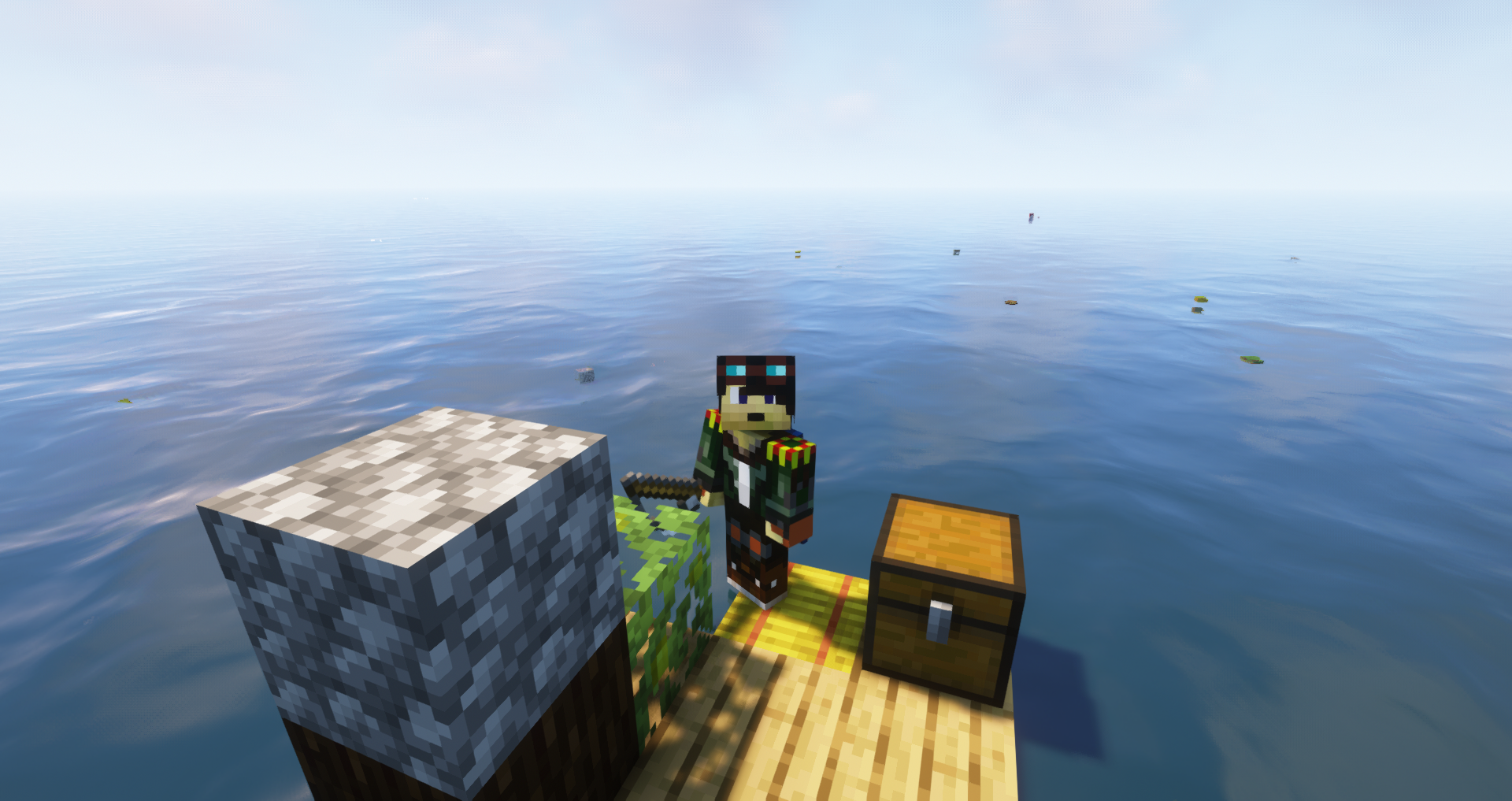 Ce concept a donc été repris par Pinecumber pour l’adapter à Minecraft. Vous commencerez votre survie avec une canne à pêche et vous devrez attirez des objets avec et afin de les stocker dans votre coffre, vous pouvez obtenir toutes sortes d’objets et vous pourrez également explorer des monuments sous marins, des épaves, des grottes souterraines etc.. Il n’y a qu’un seul endroit qui se trouve au-dessus de l’eau et c’est votre radeau. Sachez que l’endurance est maintenue, même lorsque vous êtes dans l’eau, alors ne nagez pas trop vite ou vous serez ralenti.