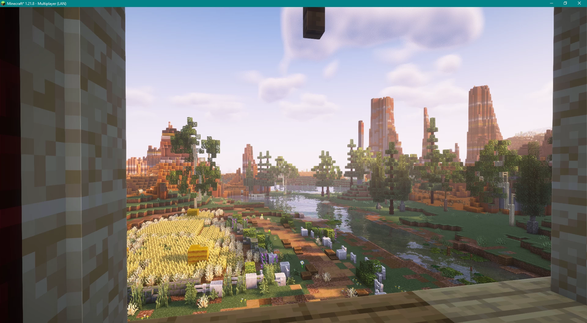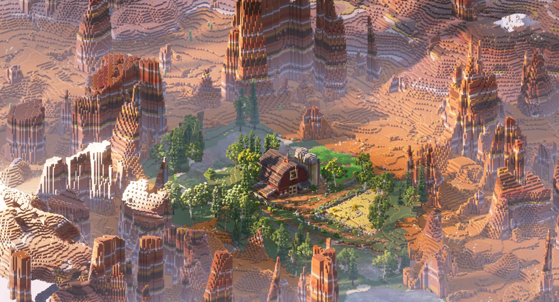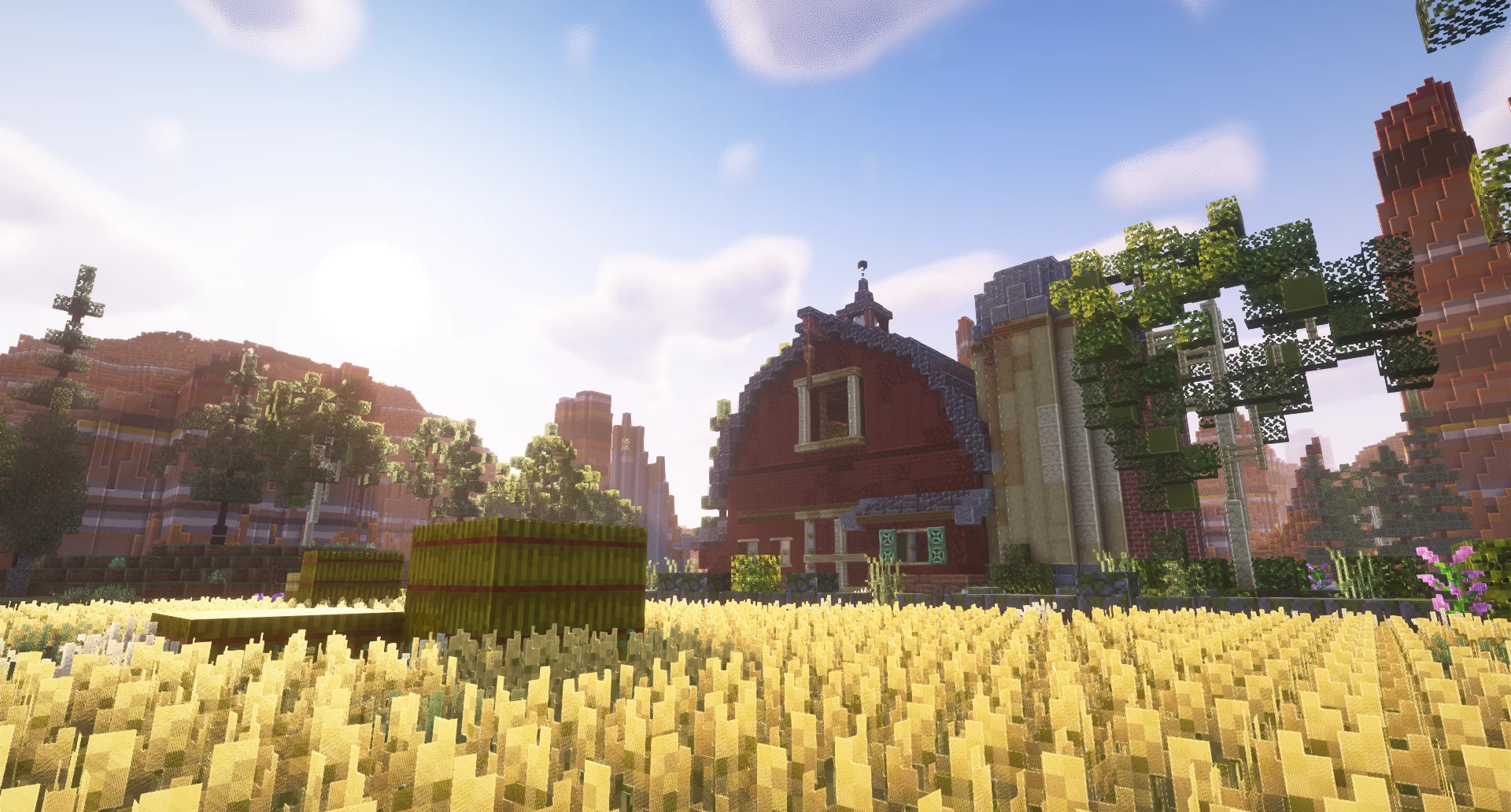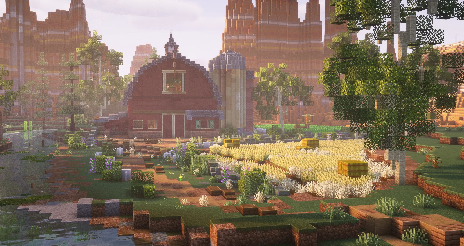 Le choix du biome n’est pas anodin. La ferme contraste avec les couleurs chaudes et arides des badlands, ce qui crée un rendu visuel intéressant. Les champs cultivés apportent une touche de vert au milieu des terres orangées, et la grande grange devient un point de repère naturel dans le paysage.
