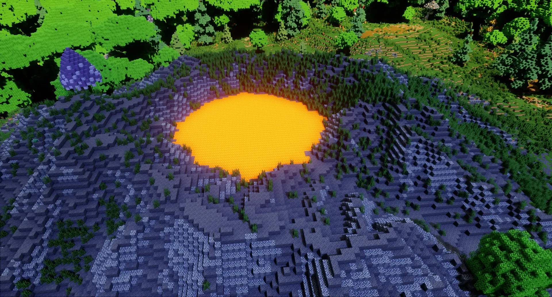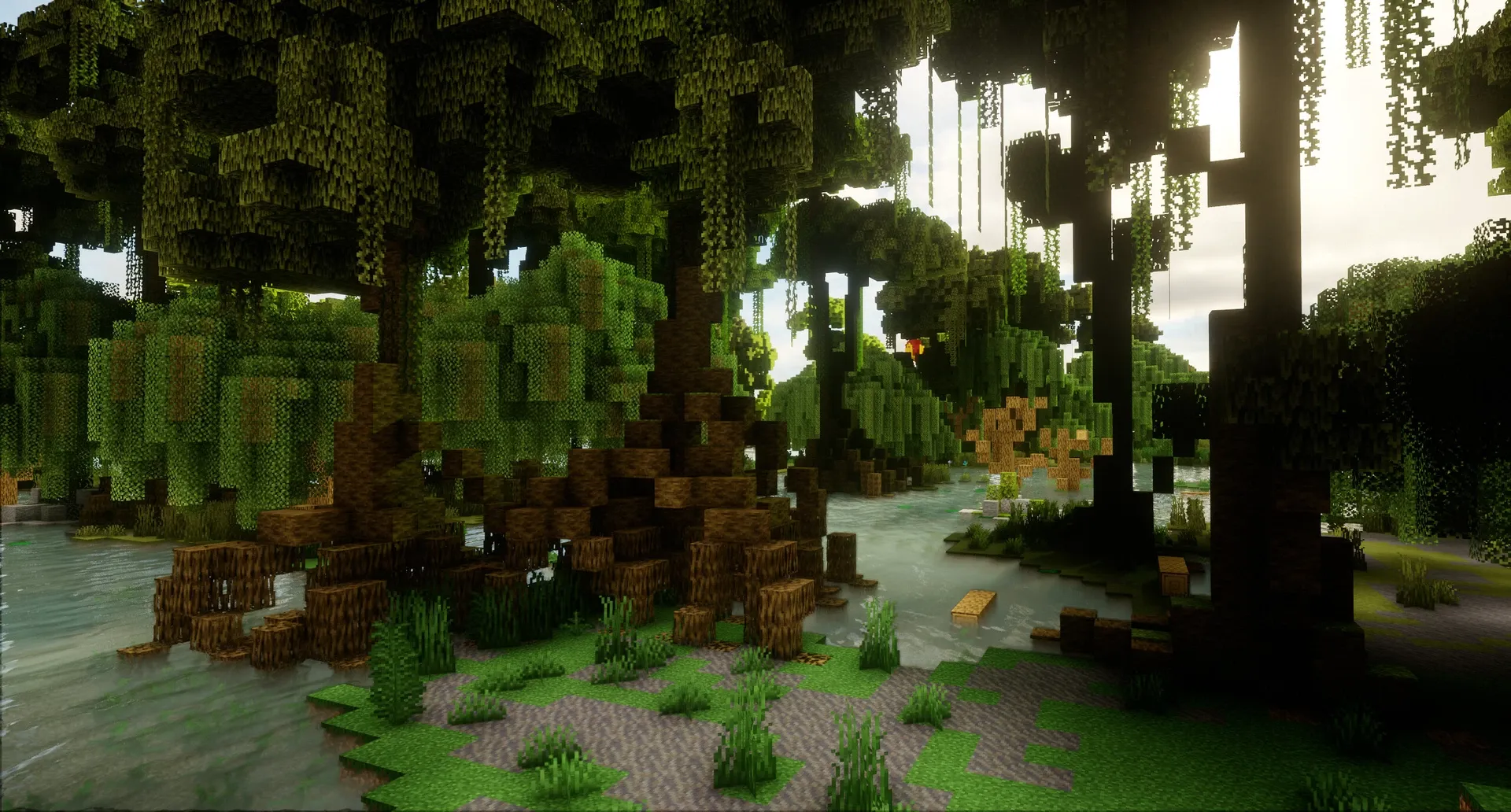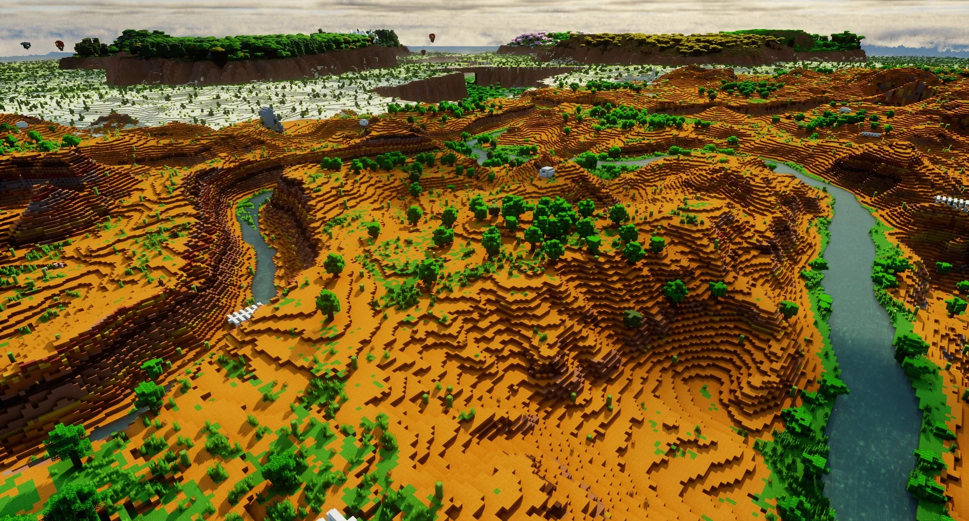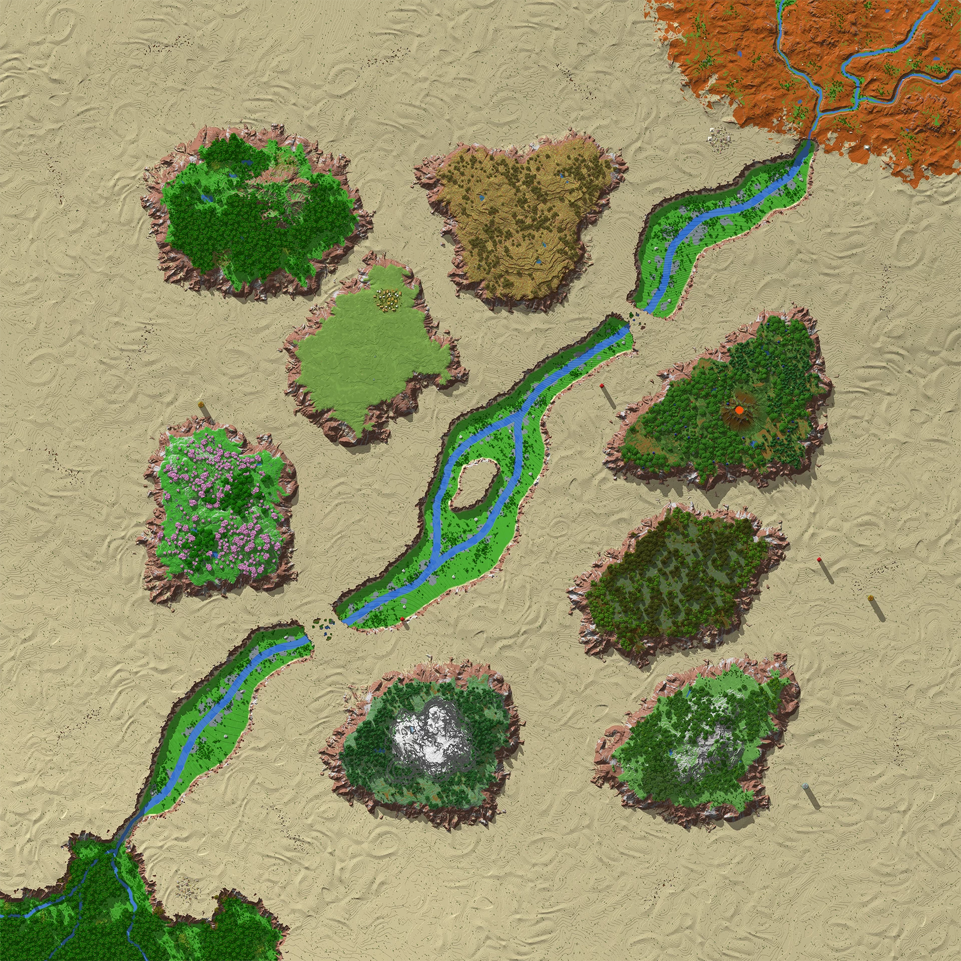 Côté biomes, la carte rassemble les grands classiques — forêt de chênes, forêt de pins, taïga, plaines, jungle, toundra, désert, forêt sombre, savane, marais et mangrove — avec une touche plus colorée : une forêt de cerisiers ponctuée de champignons géants. Les ressources « modernes » annoncées (bambous, buissons, baies) complètent l’ensemble.