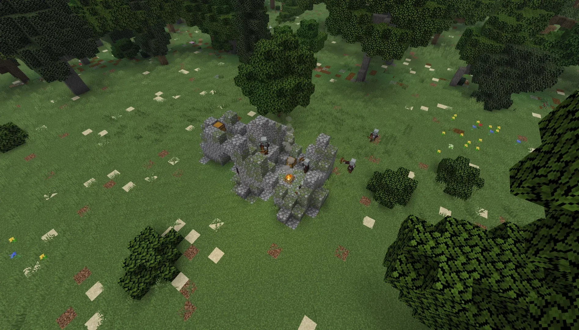 Au niveau des structures, la map inclut des donjons custom, des huttes de villageois, des chariots de marchands et campements de bandits le long des routes, des temples du désert et de la jungle, des monuments océaniques et en deepslate, ainsi que des épaves. Les strongholds, trial chambers et autres structures vanilla ne génèrent pas naturellement. Il faut utiliser la commande /place pour les faire apparaître si besoin.
