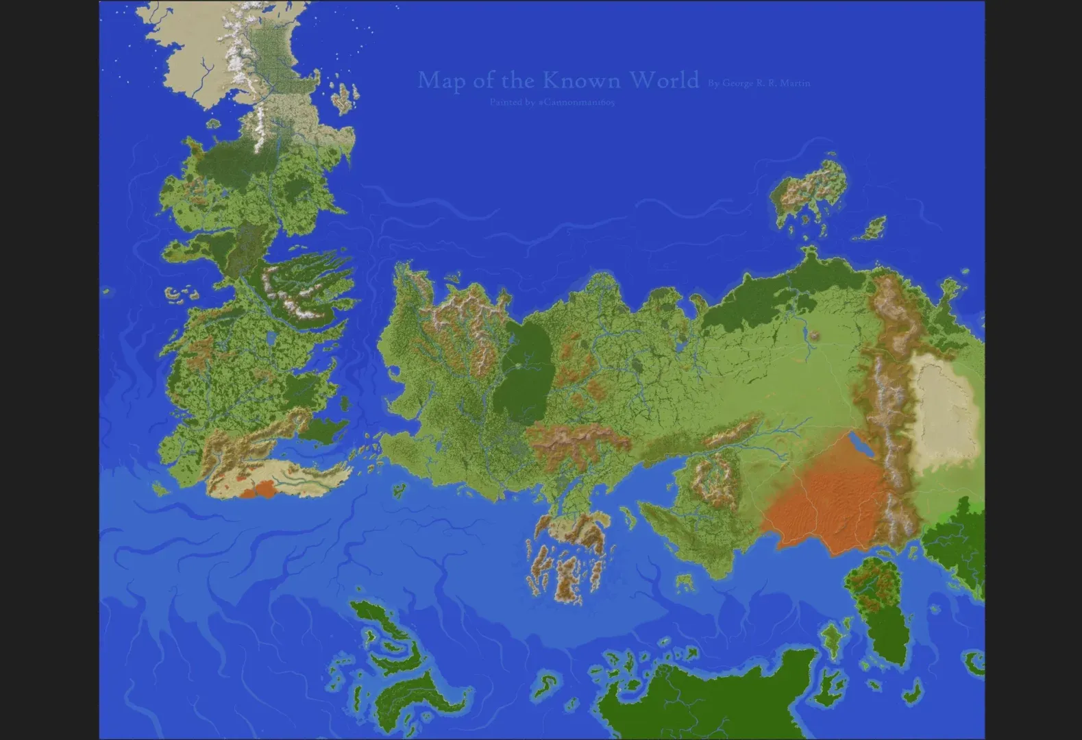 Le créateur a choisi de se concentrer sur les régions documentées dans les livres. Asshai et les terres situées plus à l’est n’apparaissent donc pas, restant fidèle à l’idée d’un « monde connu » plutôt qu’une représentation exhaustive de toutes les mentions géographiques.