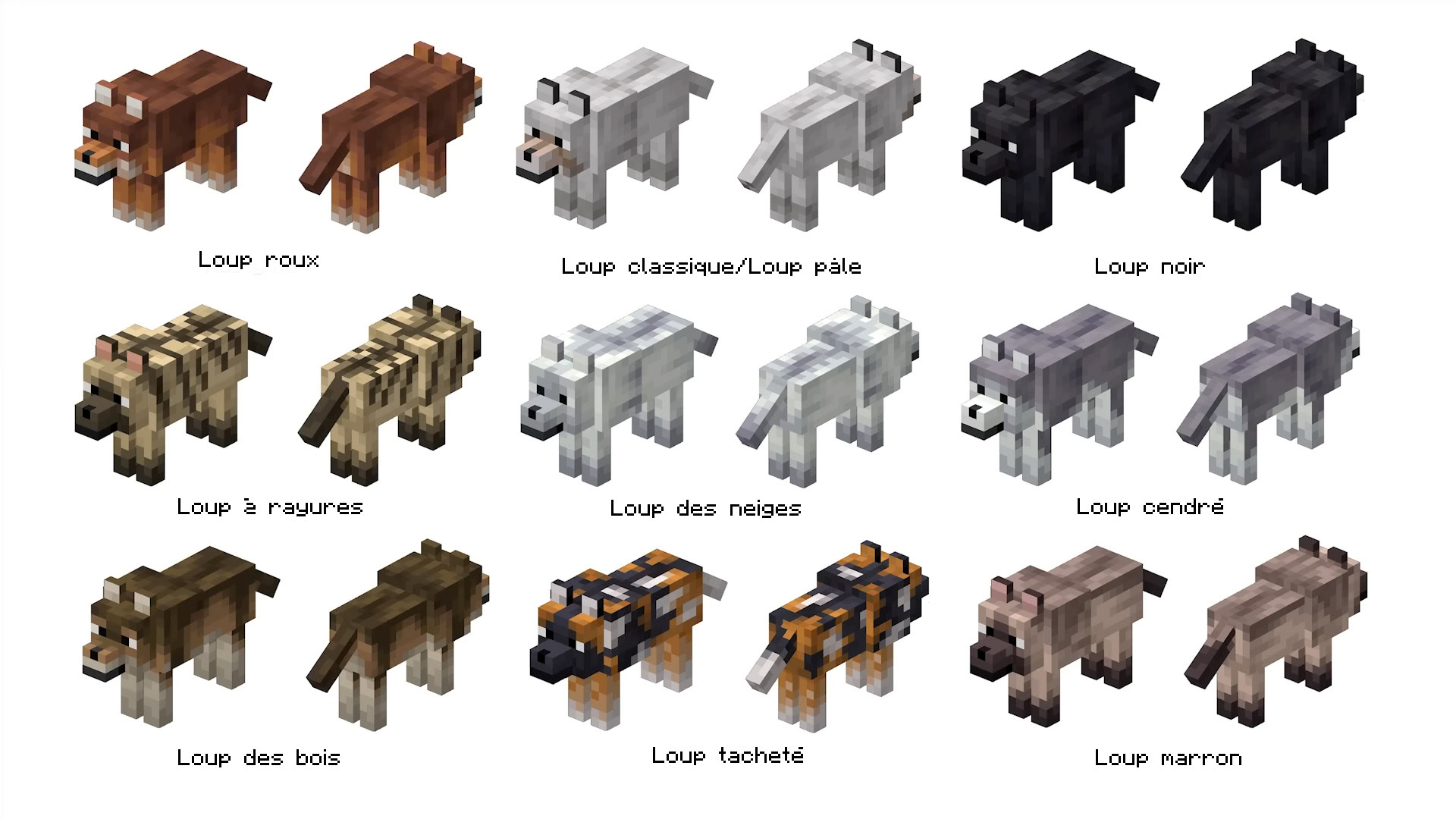 - Ajout de 9 variantes de loups qui apparaissent dans davantage de biomes :
