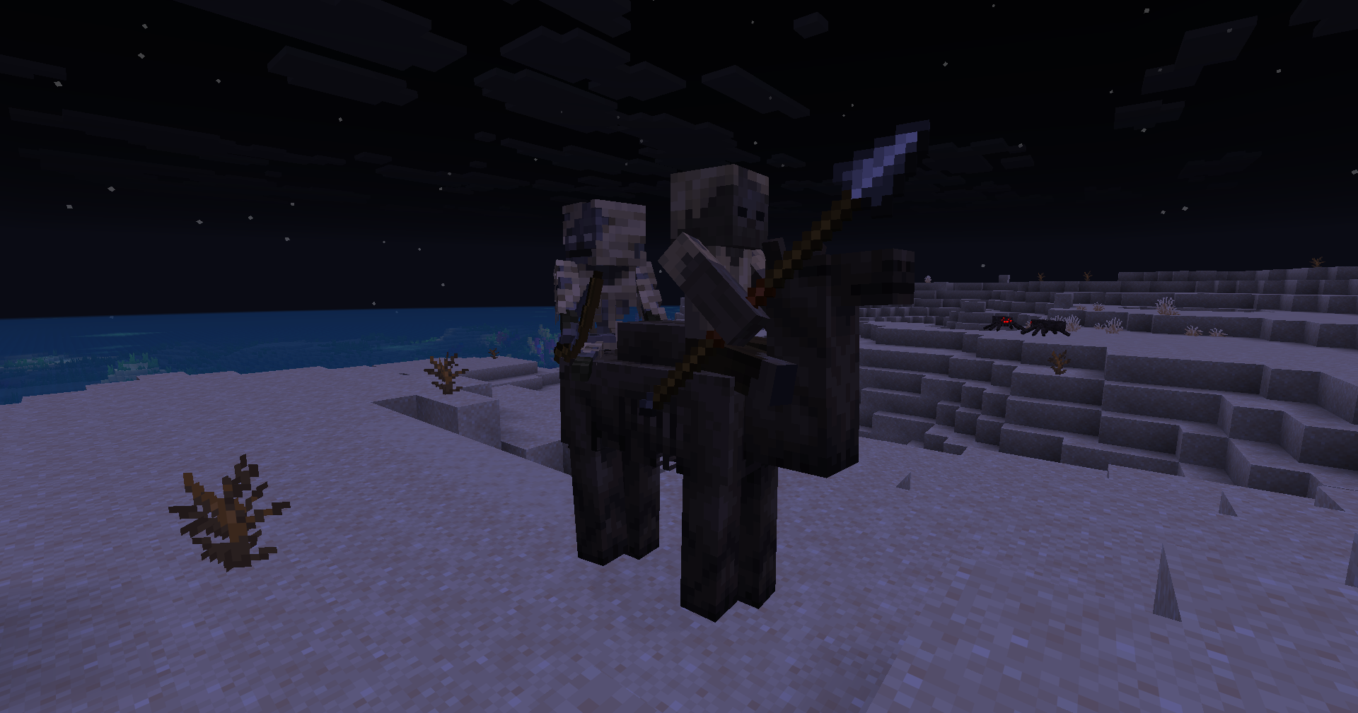 - Il est chevauché par deux créatures : un zombie momifié armé d’une lance et un Parched.