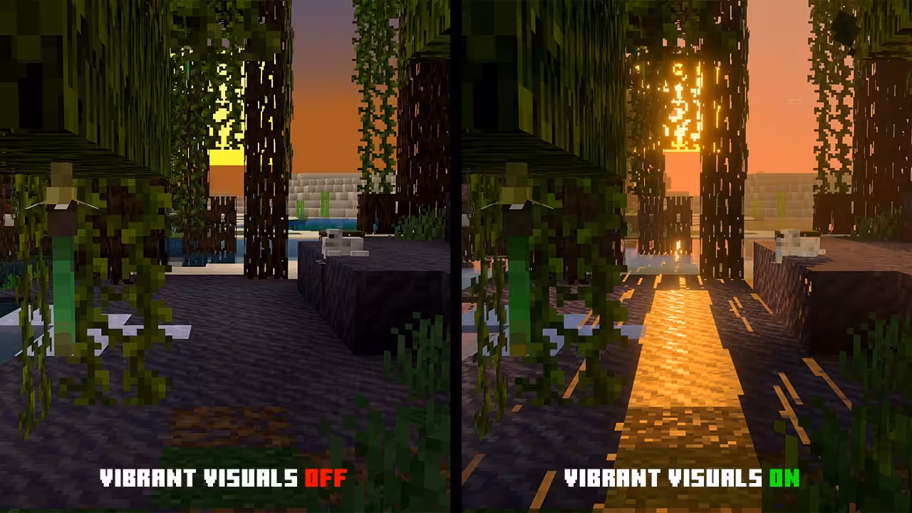 Uniquement disponible sur les appareils compatibles sous Bedrock Edition, Vibrant Visuals propose un rendu visuel retravaillé : réflexions dynamiques, effets de brume, animations de l’eau et éclairages repensés viennent donner à Minecraft une atmosphère plus vivante, tout en conservant son identité cubique. Mojang présente cette fonctionnalité comme une manière de “transformer Minecraft en véritable destination de vacances pixelisée”.