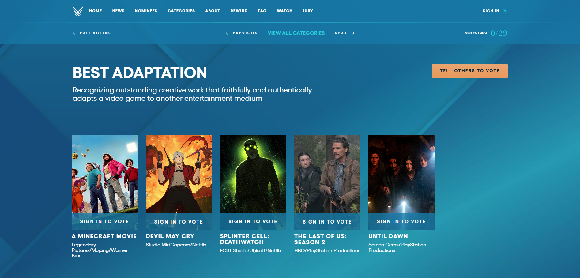 L’annonce est tombée lors du livestream de présentation. Parmi toutes les catégories dédiées aux jeux sortis cette année, une sélection met en avant les œuvres inspirées d’univers vidéoludiques. A Minecraft Movie y figure face à Devil May Cry, The Last of Us : Saison 2, Splinter Cell : Deathwatch et Until Dawn. Le compte officiel des Game Awards a également relayé ces cinq prétendants sur X, rappelant que chacun peut désormais exprimer son choix.