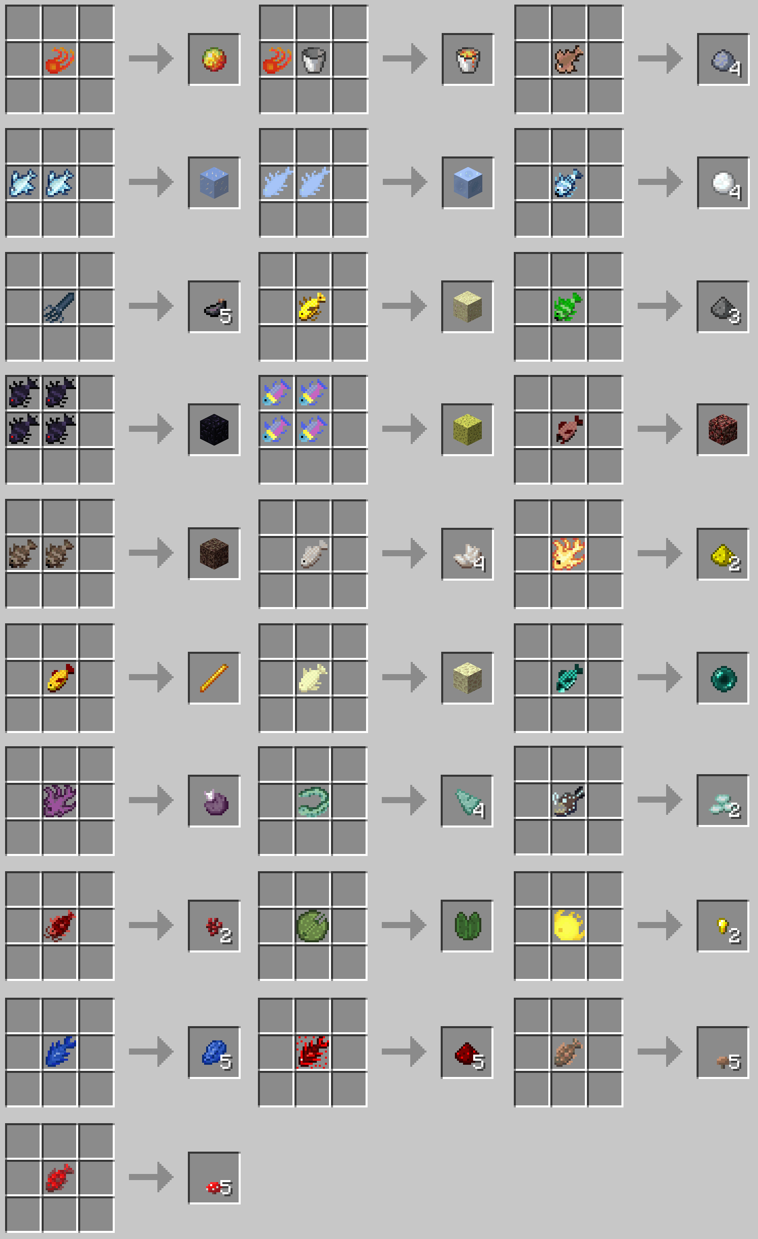 Chaque poisson que vous pêchez peut être transformé via la table de craft en ressource. Voici la liste des ressources que vous pouvez obtenir :
