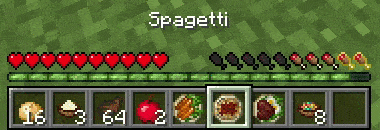 Pour rappel, la barre de faim est impactée par deux variables cachées : La saturation, qui est une seconde barre de faim, habituellement cachée. Le nombre de points de saturation restitué dépend de l’aliment. La barre de faim ne commence à se vider qu’une fois que la barre de saturation sera totalement vide, c’est donc une variable très importante. En outre, il existe également l’épuisement, qui est un compteur dont la valeur augmente avec certaines actions, comme la course, et qui ôte un point à la barre de faim ou la barre de saturation lorsqu’il atteint 10. Cette valeur est, elle-aussi, généralement cachée. Pour plus de détails sur le fonctionnement de la faim, je vous invite à lire l’article du Wiki Minecraft français à ce sujet.