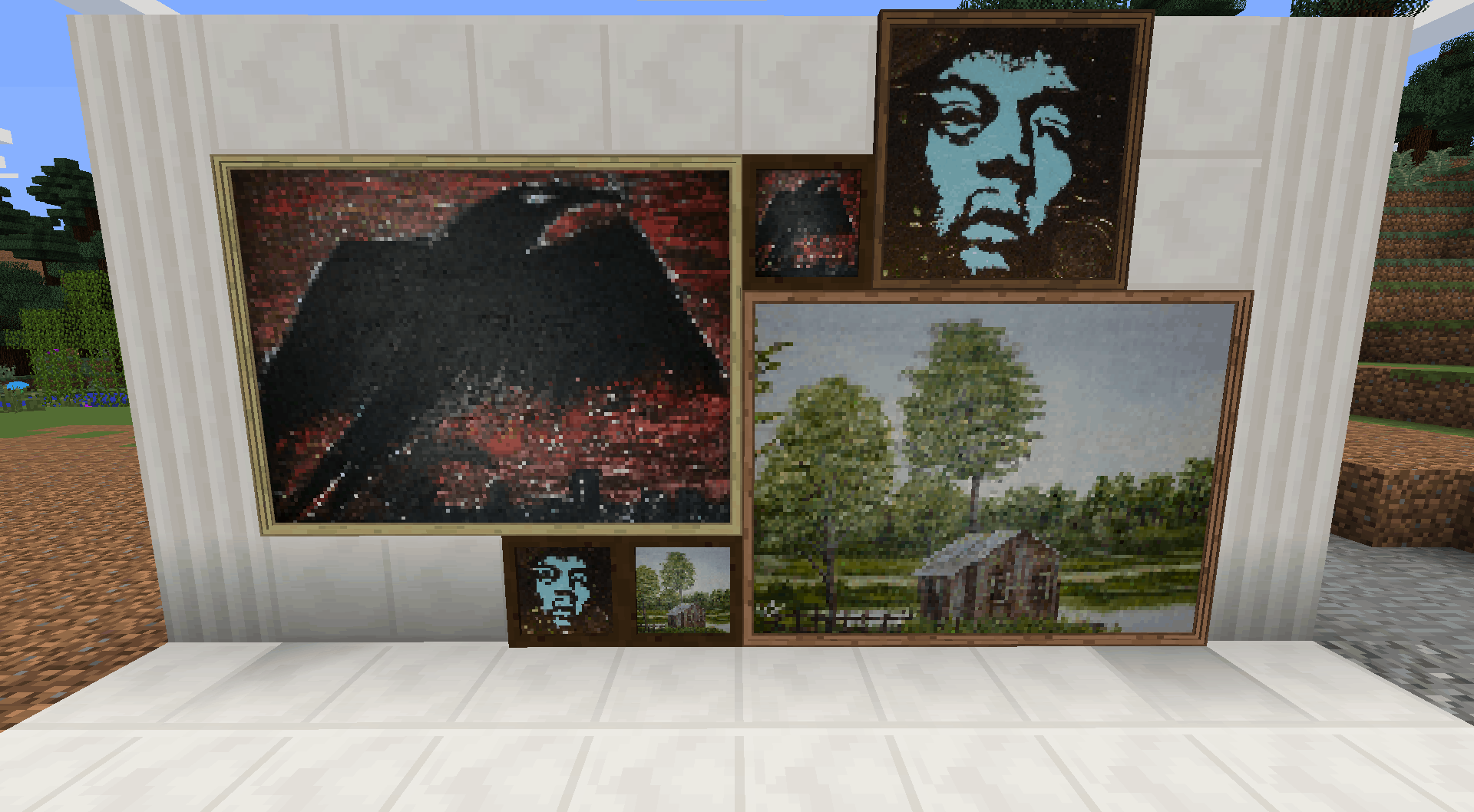 Bon, maintenant qu’on a des Canvas prêts, il est temps de les afficher sur vos murs. Les Painting Frames permettent cela. Posez ces blocs sur le mur et faites un clic-droit dessus. Vous ouvrirez leur GUI. Dans le slot prévu à cet effet, placez votre Canvas, puis réglez sa taille (1x, 2x ou 3x), sa résolution (64x ou 128x), son format (1:1 ou 1:2). Le coin principal peut être choisi dans la partie droite du GUI et détermine dans quelle direction grossira si vous choisissez d’augmenter sa taille.