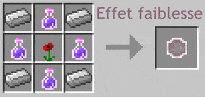 Effet faiblesse : Potion de faiblesse 1:30 | Effet lenteur : Potion de lenteur 1:30 | Effet poison : Potion de poison 0:45 | Effet résistance : Potion de force 3:00