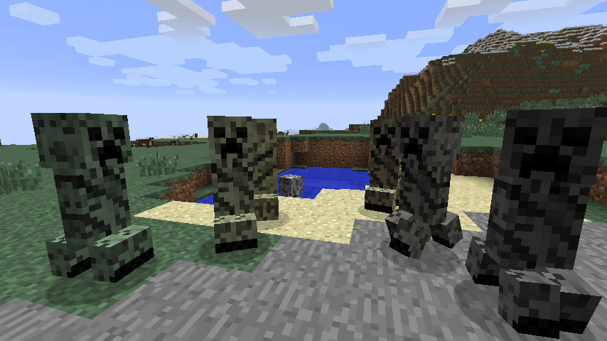 Il fut un temps où les creepers étaient bien plus vicieux que maintenant. Lors des précédentes versions, en alpha, ils possédaient en effet la même couleur que l’herbe et passaient donc inaperçus, ayant ainsi la possibilité de se faufiler à votre insu et en toute impunité sous votre nez, puis d’exploser avec le sentiment du devoir accompli. Mais avec la diversification des biomes et le changement de couleur pour l’herbe, on repère de très loin les creepers et l’effet de surprise est donc quelque peu perdu. Certes, les creepers sont toujours aussi sournois, et les améliorations de l’IA vont dans ce sens, mais leur couleur les rend encore trop visibles, repérables de loin, et donc vulnérables aux tirs des archers.