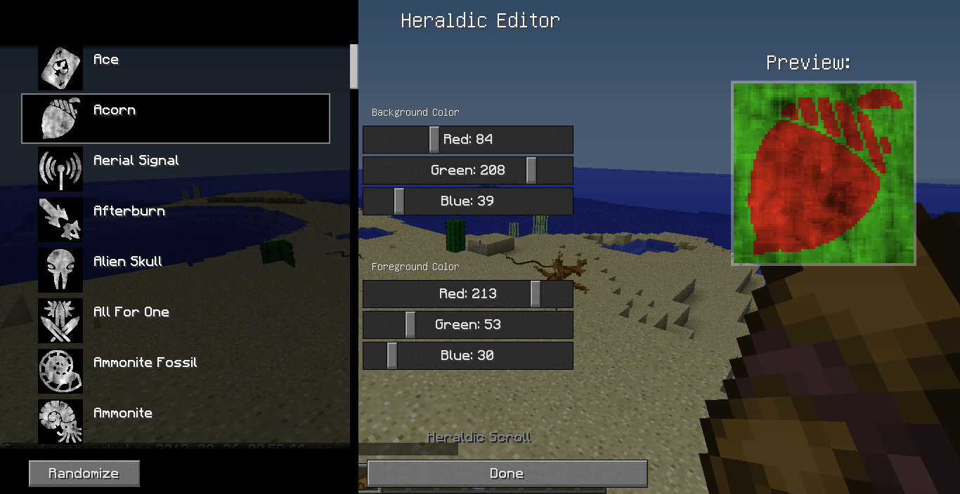 Salut tout le monde, aujourd’hui je vous présente un mod de décoration original, qui est un vrai coup de cœur pour moi ! CraftHeraldry vous permettra, comme son nom l’indique, de pratiquer la science héraldique dans Minecraft ; en clair, de créer vos propres armoiries et blasons. Vous pourrez ainsi agrémenter vos bâtiments de bannières personnalisées aux textures détaillées et agréables à l’œil. Un point fort de ce mod est qu’il fonctionne en multijoueur, il est donc idéal pour décorer votre serveur !