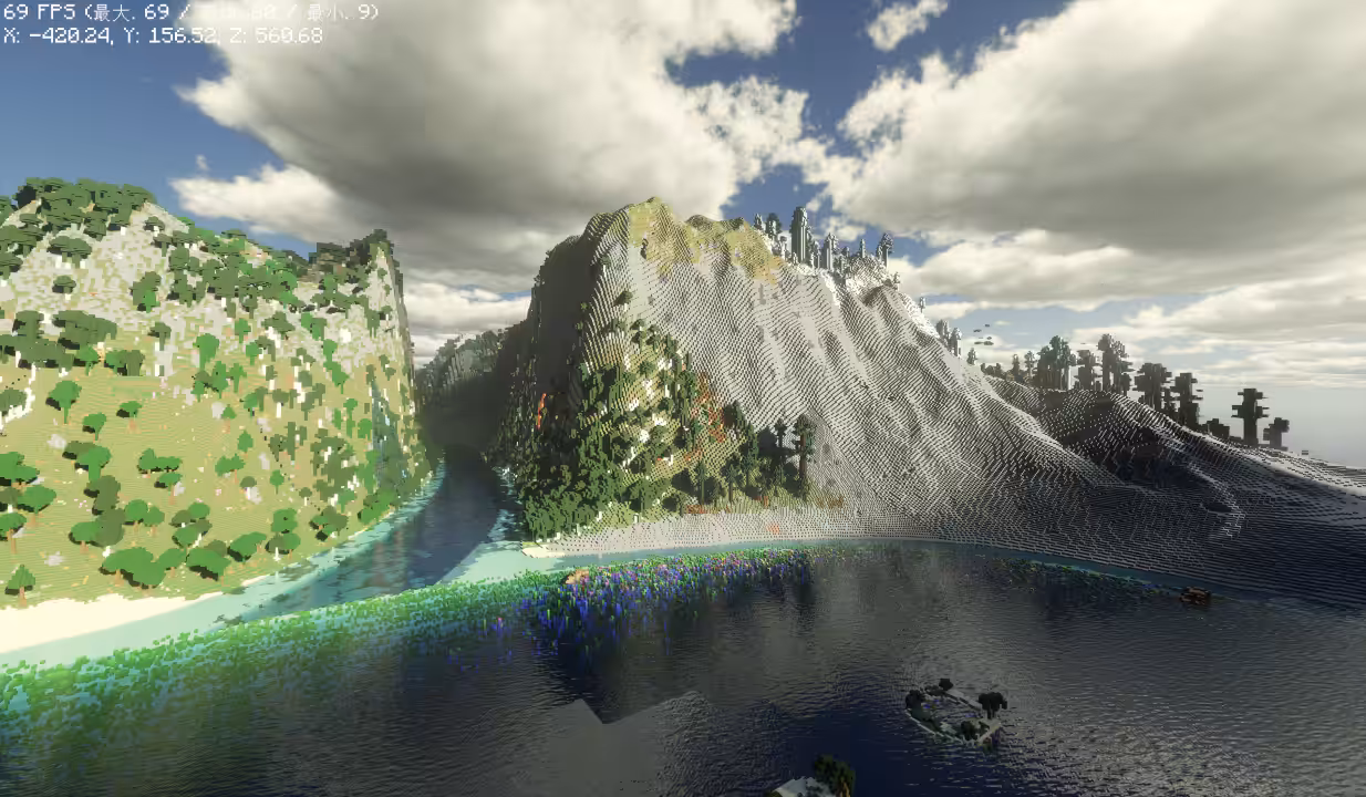 - Rivières traversant les différents biomes : Des rivières sinueuses traversent les biomes avec des différences d’altitude, donnant une impression de dynamisme au paysage.