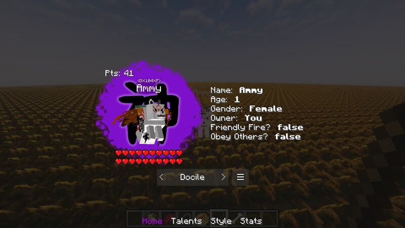 Pour commencer à interagir avec votre chien, faites un clic droit sur le chien à tout moment avec un bâton, ou Sneak + clic droit pour ouvrir l’interface graphique. À partir de là, vous pouvez commencer à personnaliser votre chien, le nommer, ajuster son mode, etc.