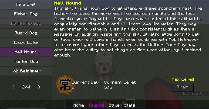 Creeper Sweeper permet à votre chien de repousser les creepers, et Doggy Dash augmente sa vitesse de course. Fisher Dog permet à votre chien de pêcher, et Happy Eater améliore l’efficacité de la nourriture consommée par votre chien. Pest Fighter aide votre chien à combattre les nuisibles, tandis que Poison Fang ajoute un effet de poison à ses attaques.