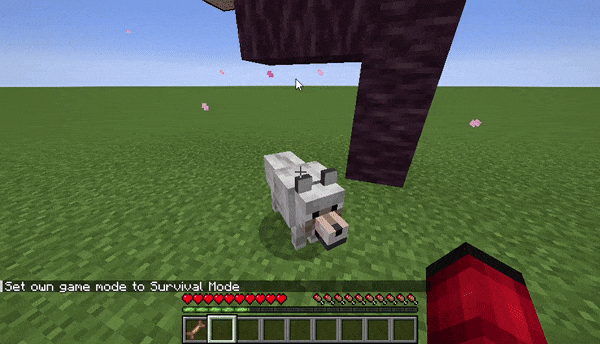 - Blessé (I) : Dans ce mode, la santé de votre chien sera fixée à 1/2 cœur (1 HP) et ne descendra pas à 0, empêchant ainsi la mort du chien. Votre chien sera visiblement blessé, n’attaquera pas et ne vous laissera pas interagir avec lui (sauf lorsqu’il est assis). Pour forcer le chien à quitter ce mode avec une santé complète, donnez-lui un Totem d’Immortalité. Ce mode peut être désactivé dans les paramètres de configuration.