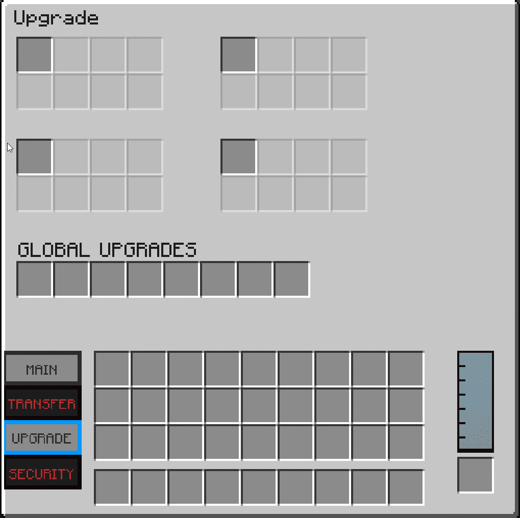Pour revenir à l’interface des upgrades, dans les fentes qui se trouvent à côté des éléments que vous avez inséré, vous pouvez y déposer des upgrades spécialement dédiés à l’objet en place. Dans les fentes Global Upgrades, vous pouvez y insérer des upgrades qui fonctionneront sur l’ensemble des machines que vous avez mis dans la table.