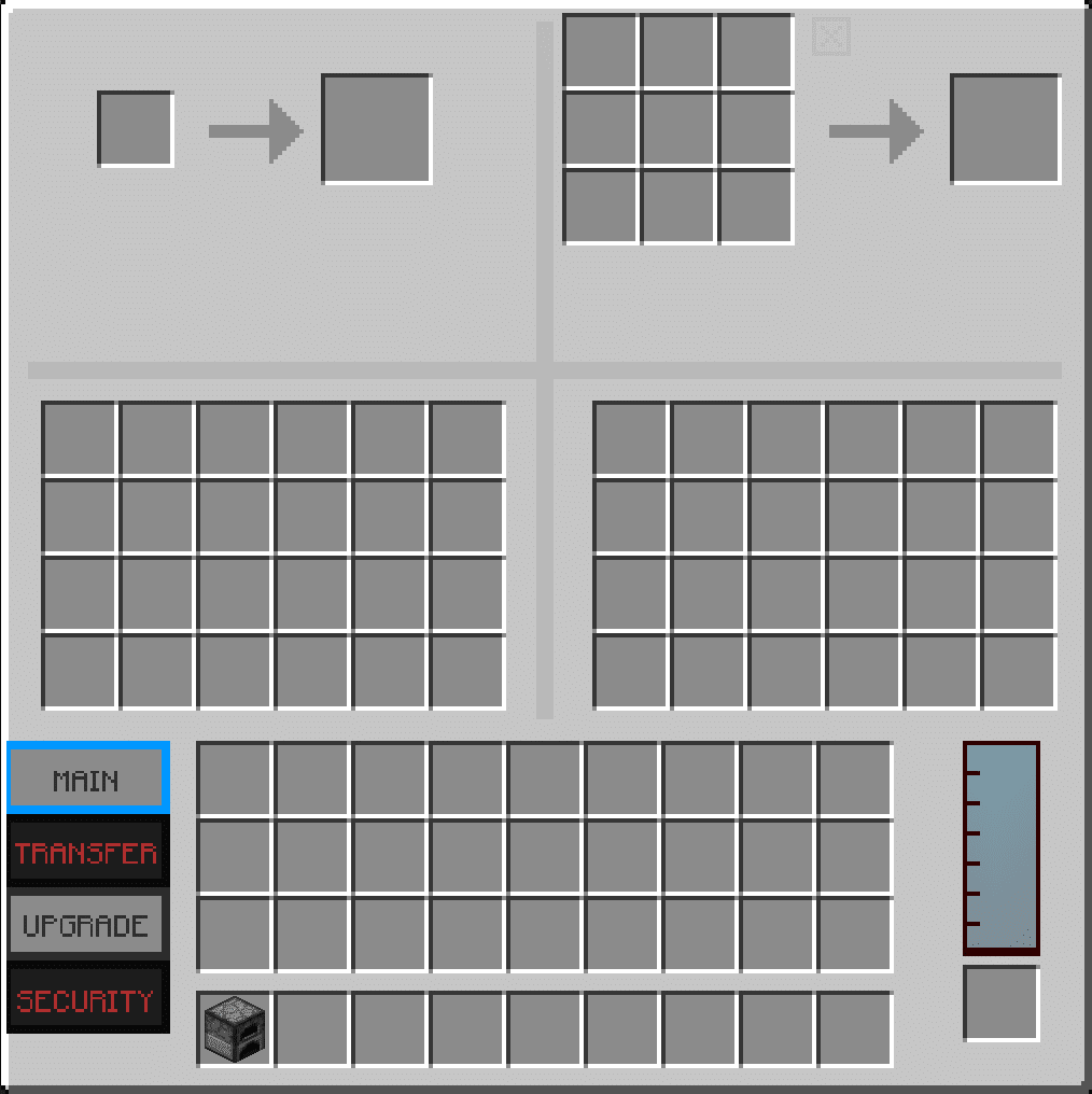 Pour l’expliquer, c’est assez simple. L’espace où un texte indique qu’il faut placer des machines/objets, est l’endroit ou vous retrouverez votre table de craft, le four et les coffres. Les fentes montrent votre inventaire et encore en dessous, vous retrouverez la barre d’inventaire. Sur la droite, il s’agira de l’endroit ou vous placerez votre comburant comme du charbon par exemple, que l’on pourra utiliser pour diverses actions.