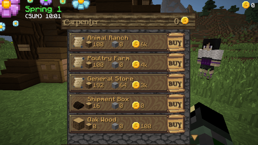 Maintenant que notre champs est opérationnel, il faudra songer à vendre les récoltes. Et bien, il y a une shipment box qui vous permettra de déposer vos récoltes et une fois la nuit passée, vous recevrez une somme d’argent. Il y a des plantations qui rapporteront un peu plus que les autres. Ça sera à vous de voir ce qui est le plus rentable. Allez voir le charpentier, et achetez lui la shipment box :