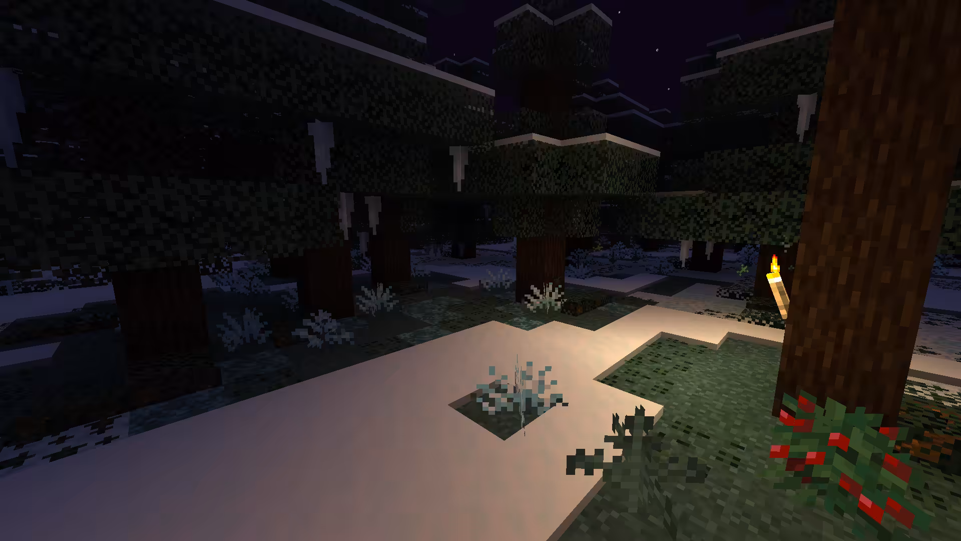 Dans les biomes froids, vous pouvez voir du givre se former la nuit sur les blocs de verre ou sur l’herbe. C’est un effet purement cosmétique, mais très joli pour construire avec & ajoute une touche supplémentaire bien nécessaire aux constructions enneigées.