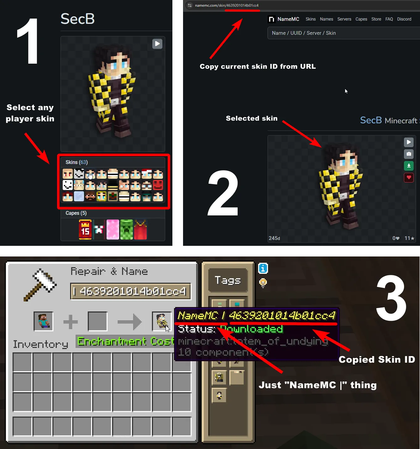 Le procédé est simple : il suffit de copier l’identifiant d’un skin sur NameMC, puis de renommer son totem avec la mentionNameMC | <identifiant du skin>.