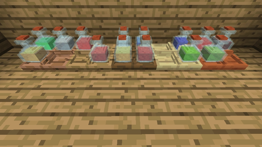 Ce plateau de potions vous permet de stocker jusqu’à quatre potions, que vous pouvez placer et retirer avec un simple clic-droit. Les potions que vous lui confiez ont une texture 3D et une couleur dépendant de leur effet, ce qui fait de ce bloc un objet aussi utile qu’esthétique. Tous les types de bois peuvent être utilisés.