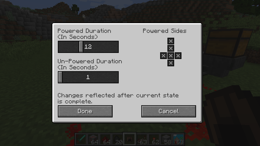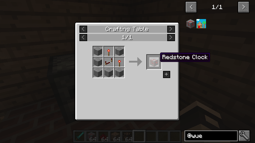 La redstone clock permet d’allumer et d’éteindre différents systèmes dans des directions et des durées configurables. Ce bloc s’allume et s’éteint périodiquement. Si vous faites un clic droit sur le bloc, vous pouvez configurer le temps ou il doit rester allumé et éteint. Vous pouvez même spécifier les côtés du bloc qui envoient de l’énergie.