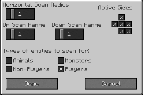 Permet de déclencher des pièges lorsque des joueurs, des monstres ou des animaux sont proches. Ce bloc peut balayer dans un rayon autour de lui pour détecter des entités et générer un signal redstone s’il en trouve un. Ce bloc peut rechercher des animaux, des non-joueurs (villageois), des monstres et des joueurs. La taille du rayon de balayage peut être configurée et les côtés qui sont scannés peuvent aussi être configurés.