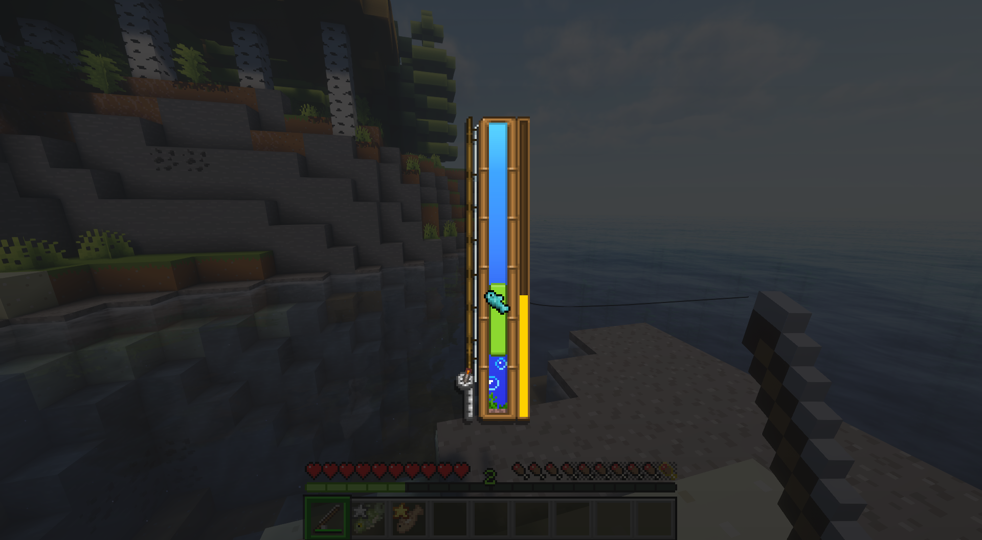 Dans ce mini-jeu, le joueur doit contrôler une petite barre verte — le « bobber » — qui monte lorsqu’on clique. L’objectif est de maintenir cette barre sur la silhouette du poisson afin de remplir une jauge latérale. Une fois la jauge pleine, la prise est validée. Le fonctionnement reprend fidèlement le système du jeu de ConcernedApe, tout en s’intégrant naturellement dans une session Minecraft.