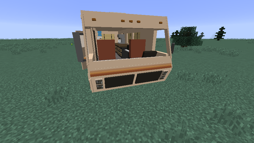 Là où ce virtuose des command blocks fait fort, c’est dans la propension de sa création à interagir avec le joueur aussi bien qu’avec son milieu. Ainsi, vous pouvez ouvrir et fermer sa portière (en faisant un clic-droit), mais aussi vivre à l’intérieur du véhicule. Il faut dire qu’avec des meubles, une cafetière, une fontaine à eau et un comptoir, ce camping car est somme tout bien équipé.