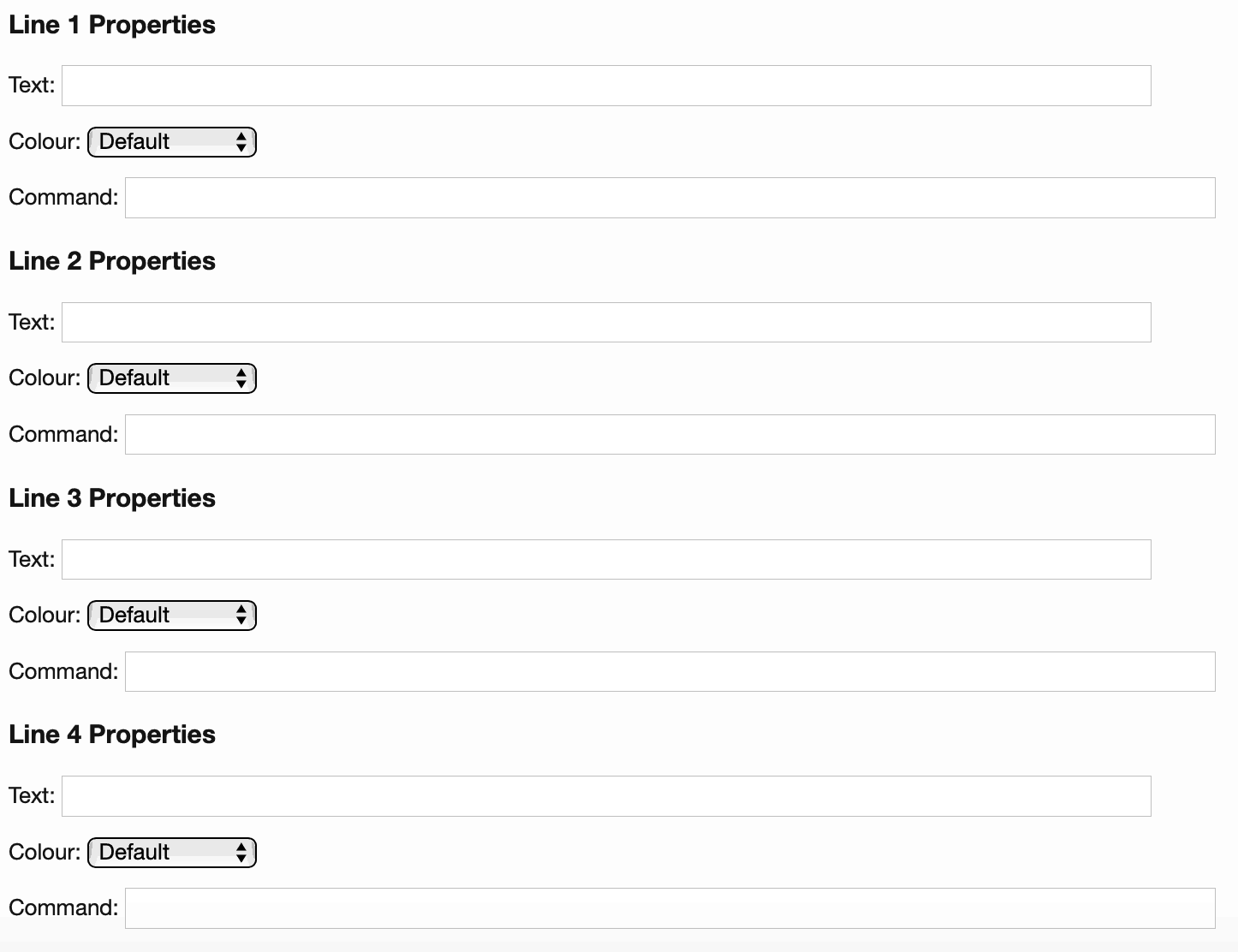Ensuite, les quatre champs ci-dessous permettent de paramétrer chacune des quatre lignes. Pour chacune d’entre elles, vous pourrez choisir le texte, sa couleur, mais aussi la commande qui sera déclenchée si un joueur clique dessus.