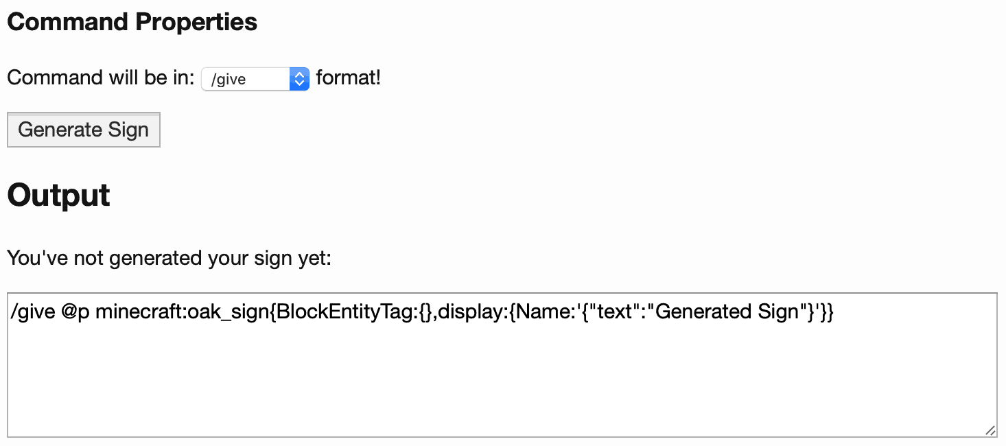 Enfin, le dernier champ permet de sélectionner le type de commande grâce auquel vous pourrez récupérer votre commande : /give, /setblock ou /data. Le bouton “generate sign” vous permettra de récupérer la commande correspondant à votre panneau dans le champ juste en-dessous.