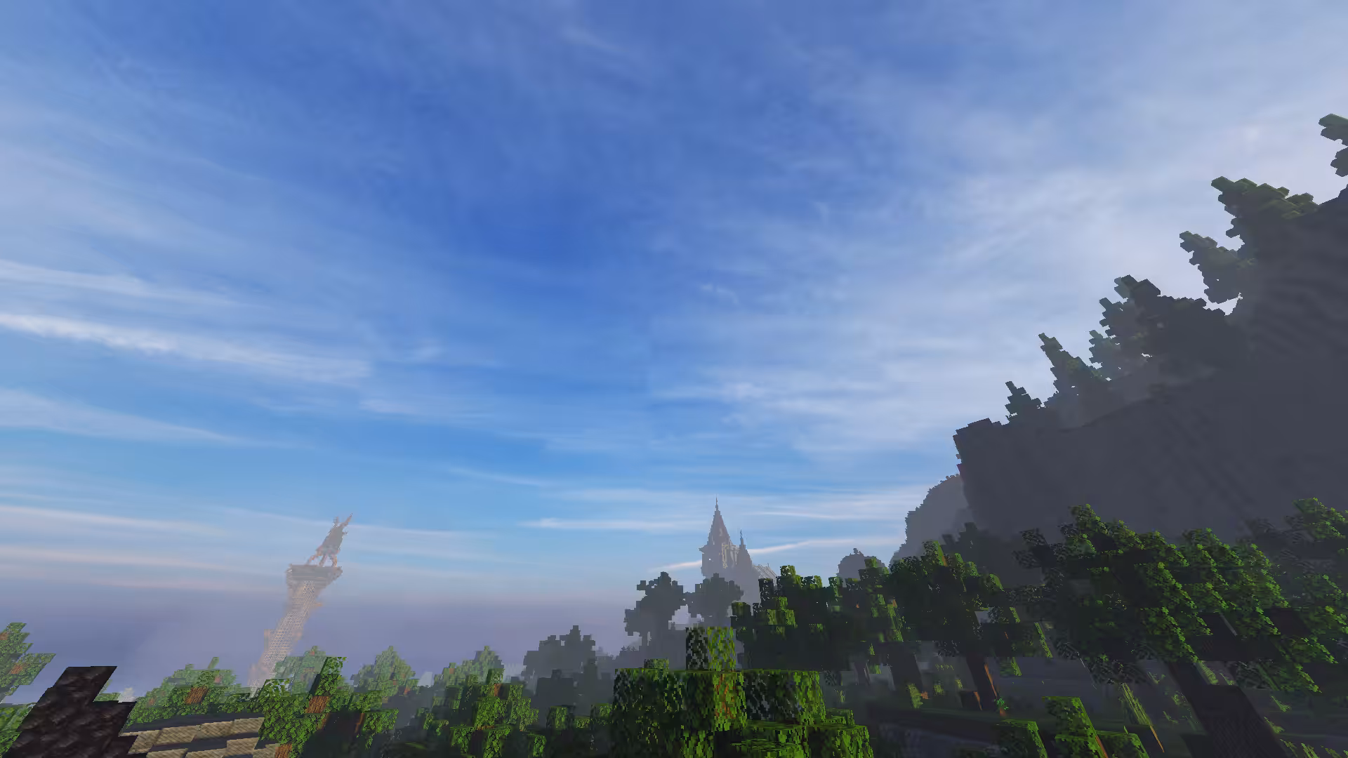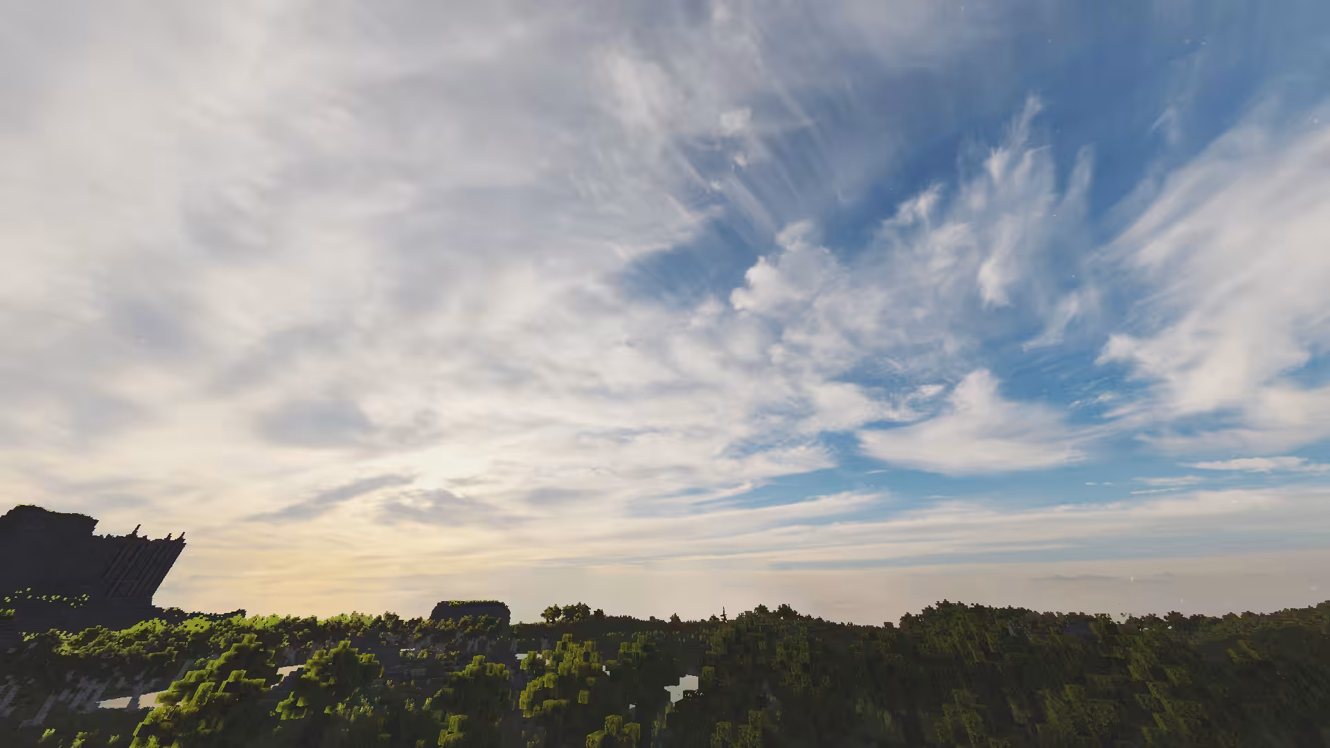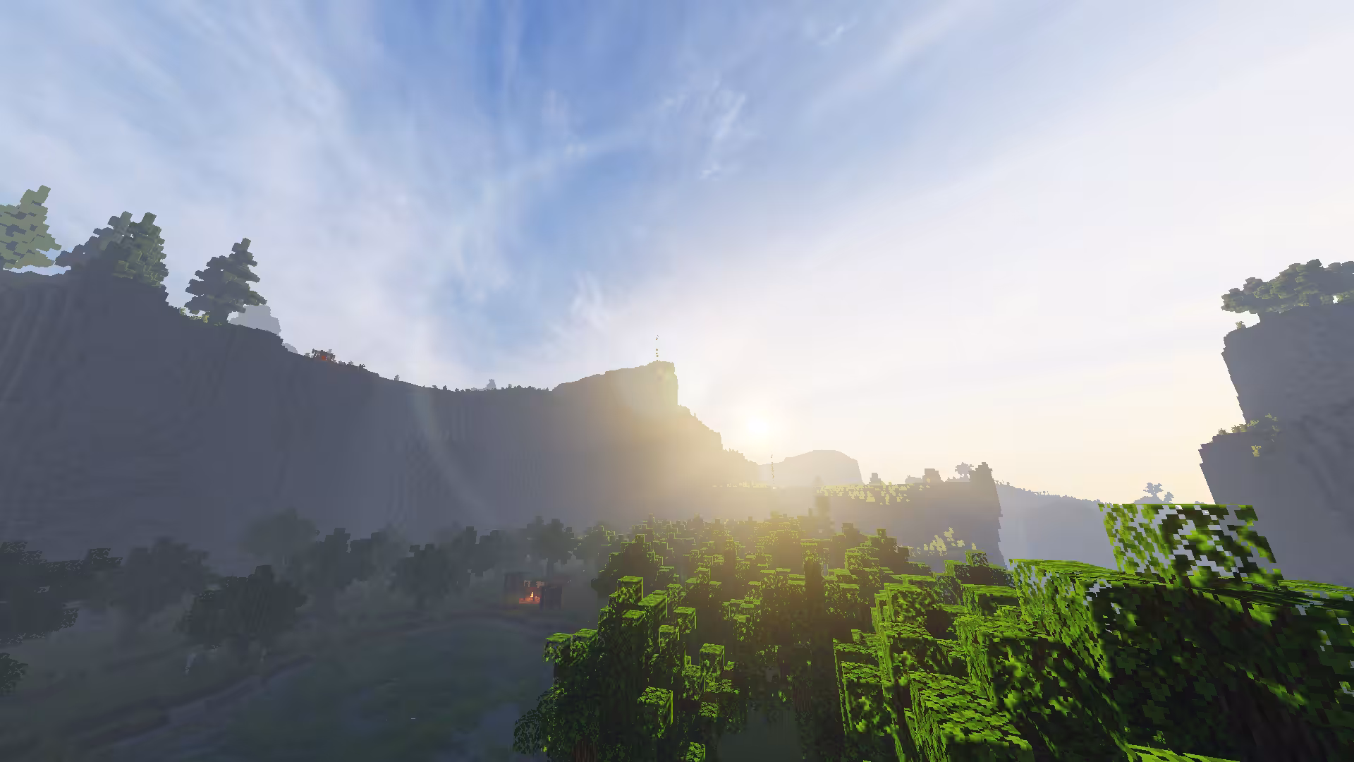 L’un des atouts majeurs de Pyvtron est son ciel en résolution 8K, qui donne à l’environnement une profondeur saisissante, notamment lors des levers ou couchers de soleil. L’eau bénéficie elle aussi d’un coloris raffiné et de réflexions partiellement basées sur le path tracing, donnant vie aux rivières et océans de Minecraft. Bien que le path tracing ne soit pas omniprésent, les effets de lumière conservent un aspect naturel et fluide, renforcé par la présence d’ombres volumétriques, de lumière ambiante (ambient occlusion) et d’un effet de brouillard.