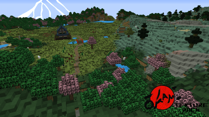 Le jeu Okami vous propose de manier certains sorts, notamment celui de créer des bombes d’un coup de “pinceau céleste”. C’est de là que vient la texture de la tnt ou encore celle du feu. Les zombies ont été adaptés des “yokäy”, ennemis du jeu. Les creepers sont devenus les parchemins verts, repaires des “yokäy”. Un symbole à l’encre rouge apparaît sur leur visage et vous retrouverez ce même coup de pinceau dans de nombreuses textures. Une touche particulière est apportée aux éléments floraux, base du jeu original qui tourne beaucoup autour de la nature.